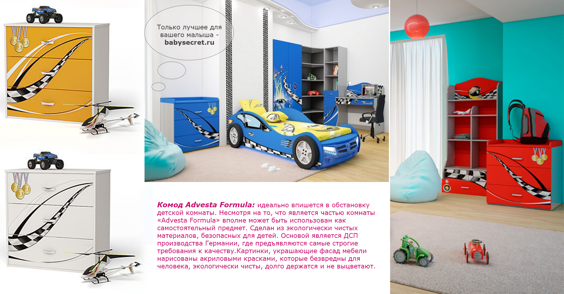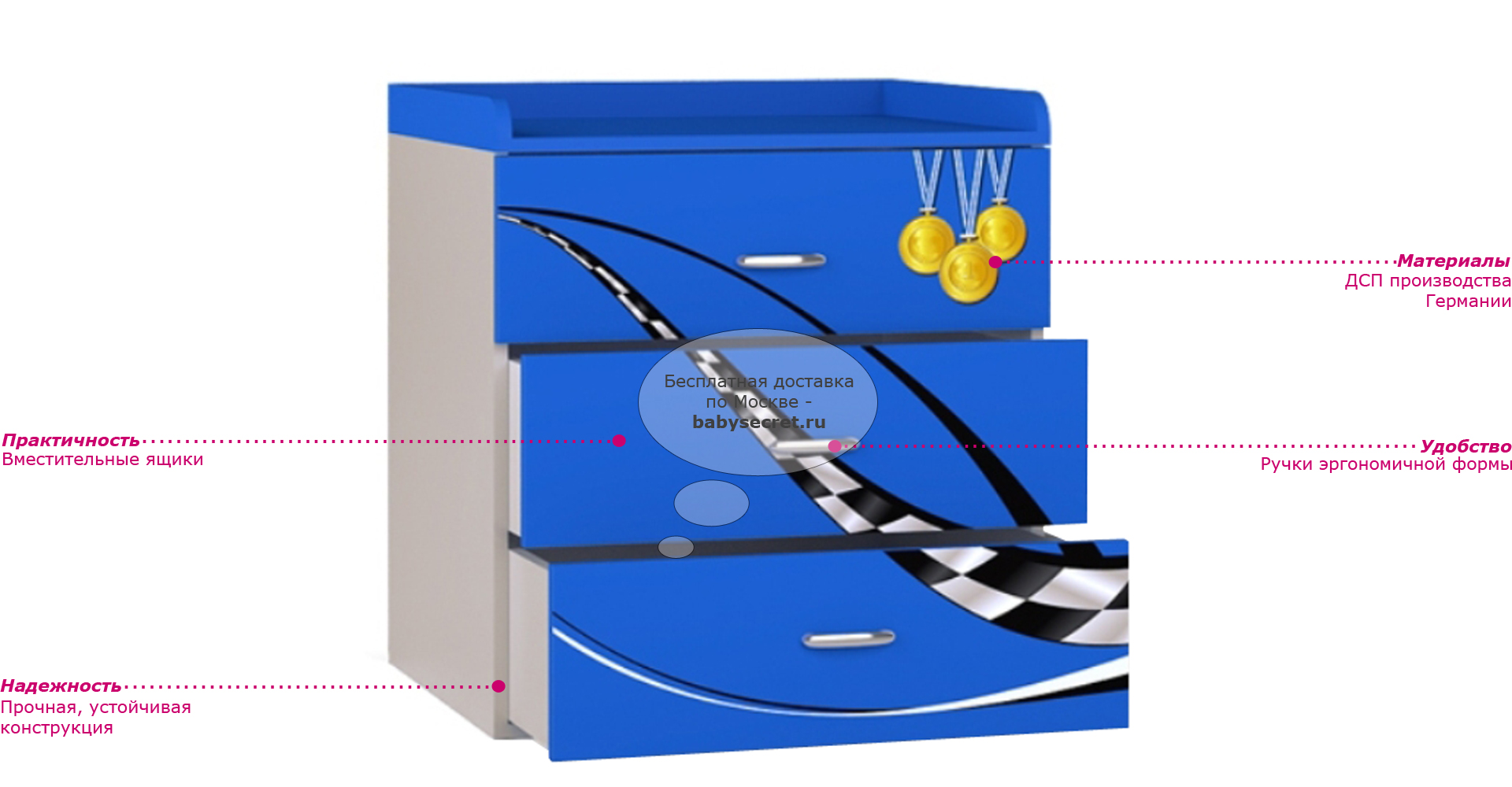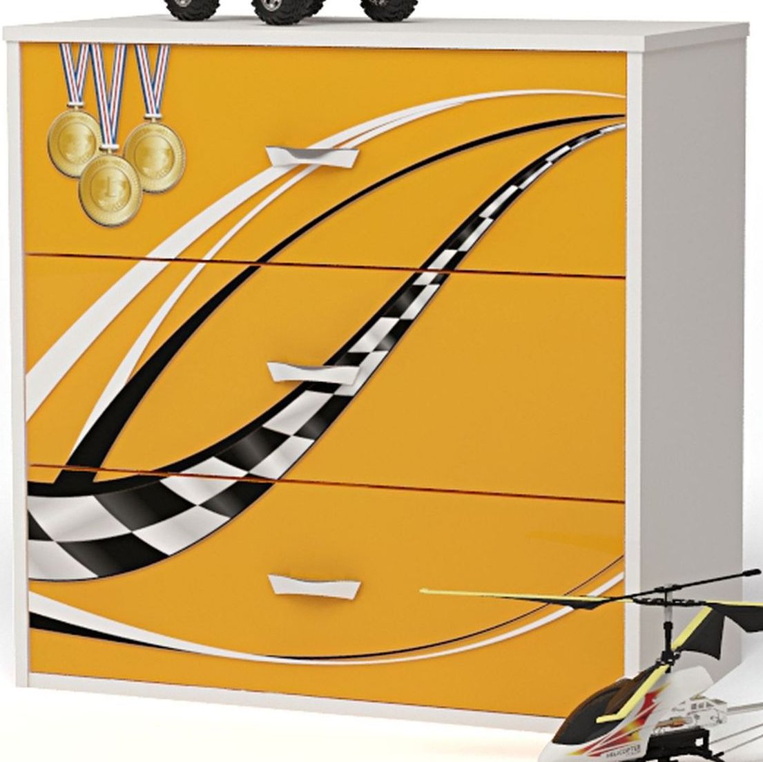 Приятные особенности комод Formula:сделан из экологически чистых материалов, безопасных для детей. Основой является ДСП производства Германии, где предъявляются самые строгие требования к качеству. У мебели есть преимущество, которое понравится, как детям, так и взрослым. Детскую мебель можно красиво оформить специальными картинками, которые изготовлены из прочных и долговечных материалов, позволяющих проводить влажную уборку. Картинки, украшающие фасады мебели нарисованы акриловыми красками, которые безвредны для человека, экологически чисты, долго держатся и не выцветают.