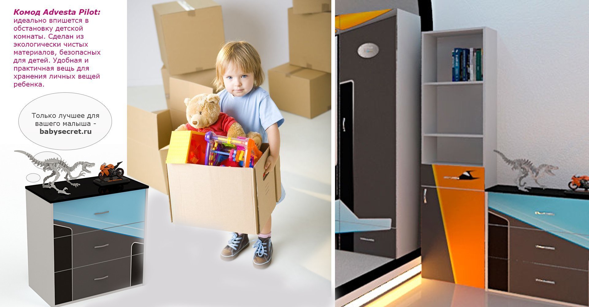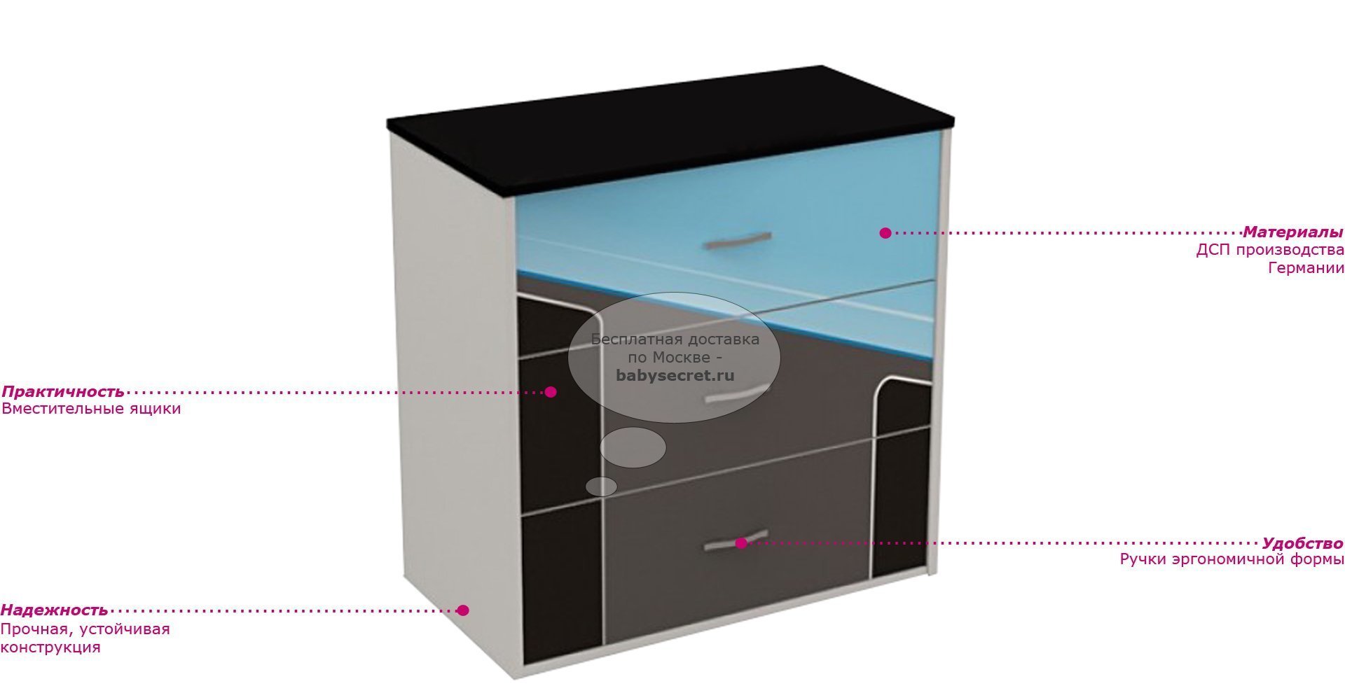 Приятные особенности комода Pilot: сделан из экологически чистых материалов, безопасных для детей. Основой является ДСП производства Германии, где предъявляются самые строгие требования к качеству.