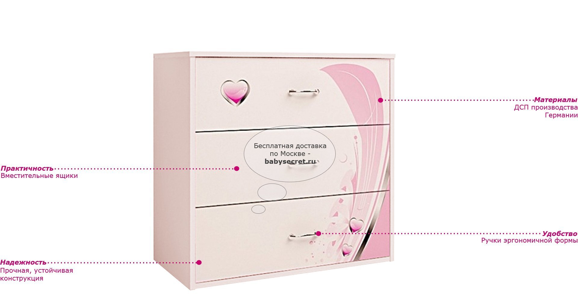 Приятные особенности комода : сделан из экологически чистых материалов, безопасных для детей. Основой является ДСП производства Германии, где предъявляются самые строгие требования к качеству.