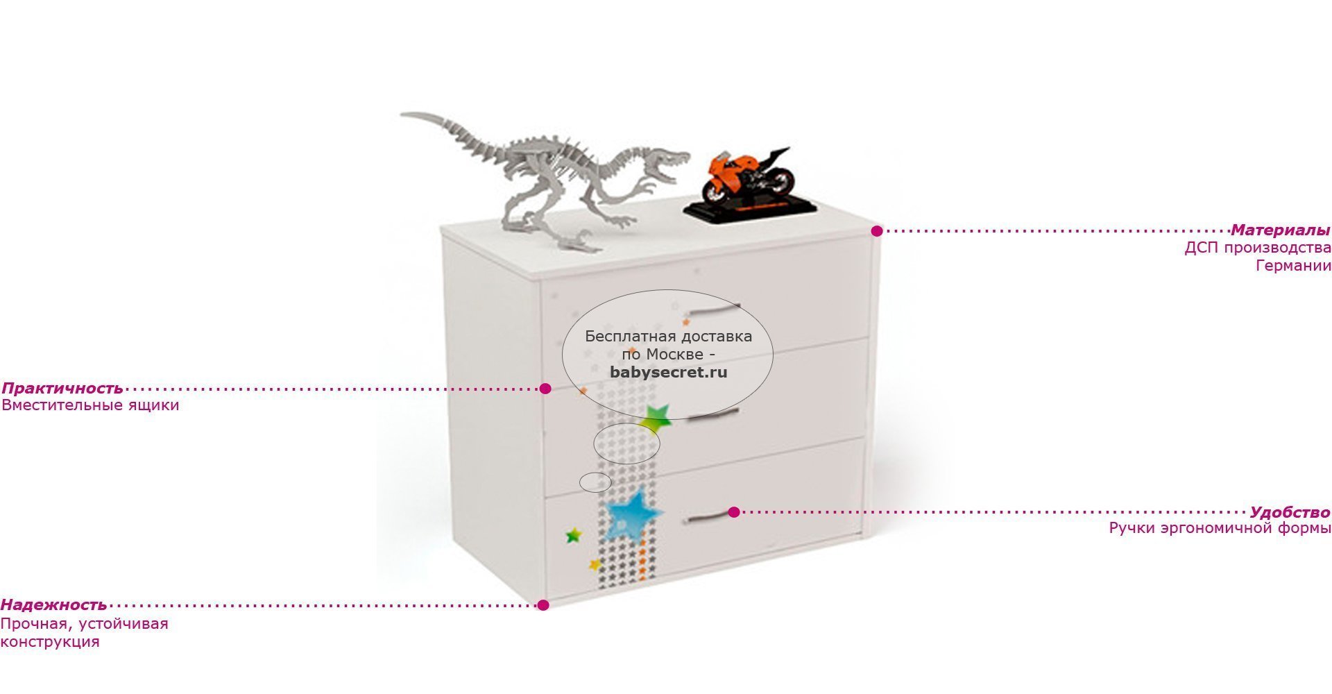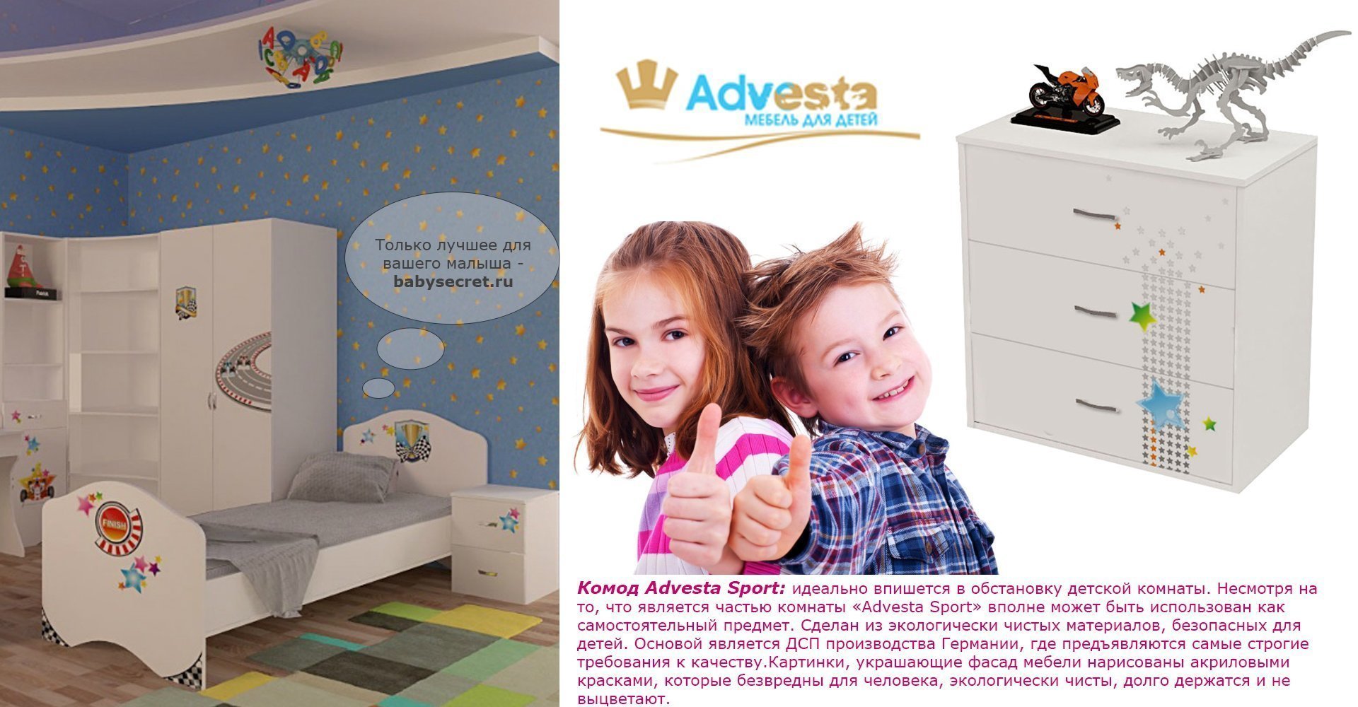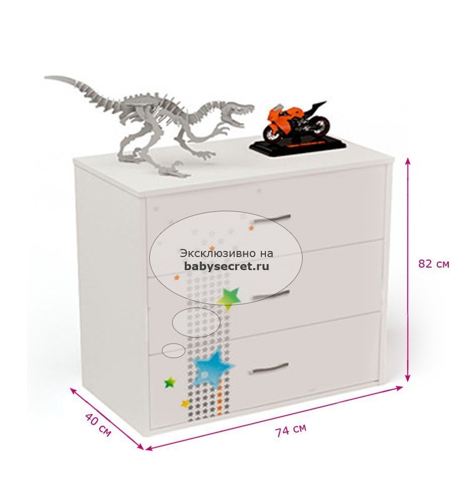 Приятные особенности комода Sport: сделан из экологически чистых материалов, безопасных для детей. Основой является ДСП производства Германии, где предъявляются самые строгие требования к качеству.У мебели есть преимущество, которое понравится, как детям, так и взрослым. Детскую мебель можно красиво оформить специальными картинками, которые изготовлены из прочных и долговечных материалов, позволяющих проводить влажную уборку. Картинки, украшающие фасады мебели нарисованы акриловыми красками, которые безвредны для человека, экологически чисты, долго держатся и не выцветают.