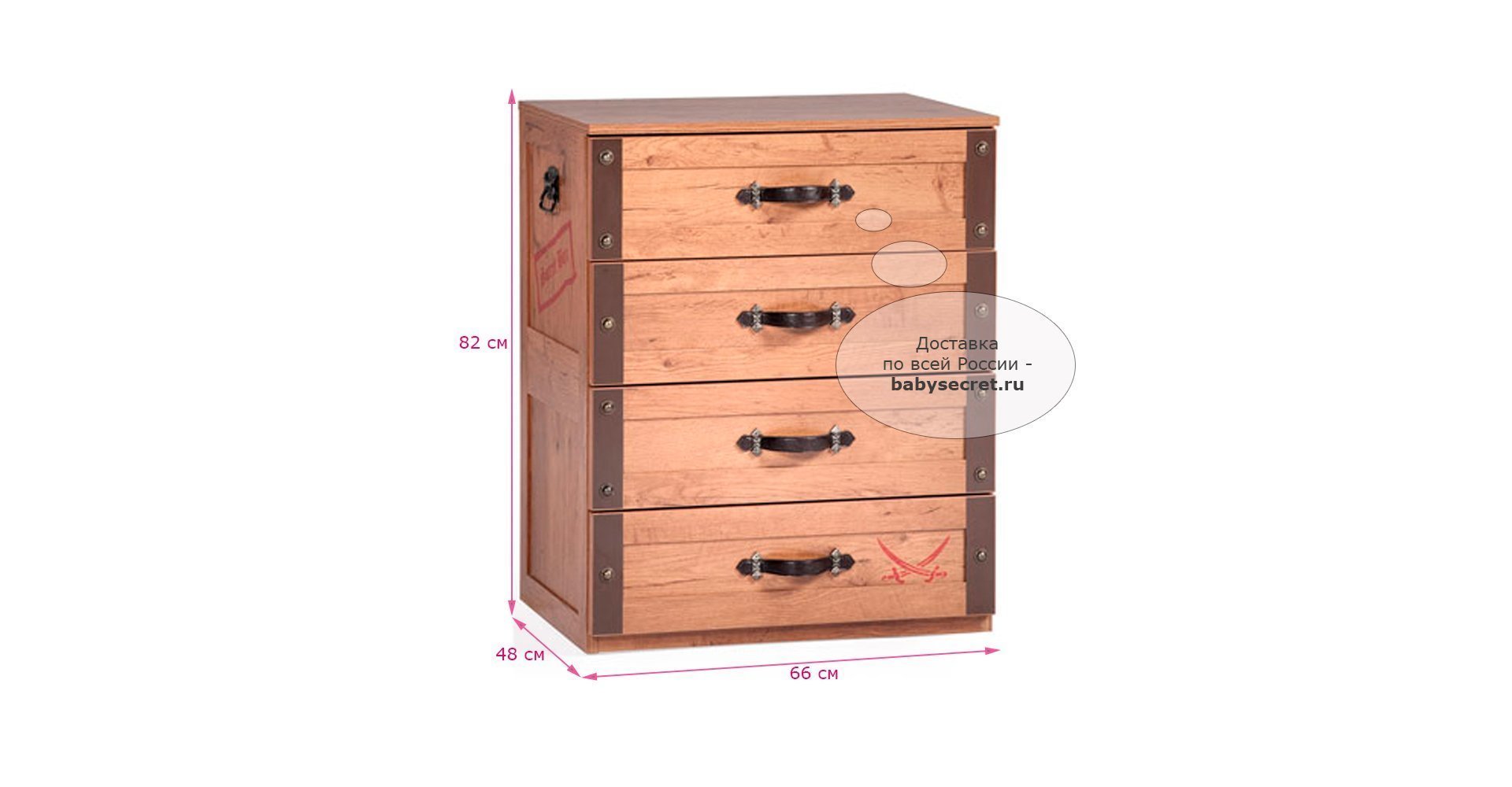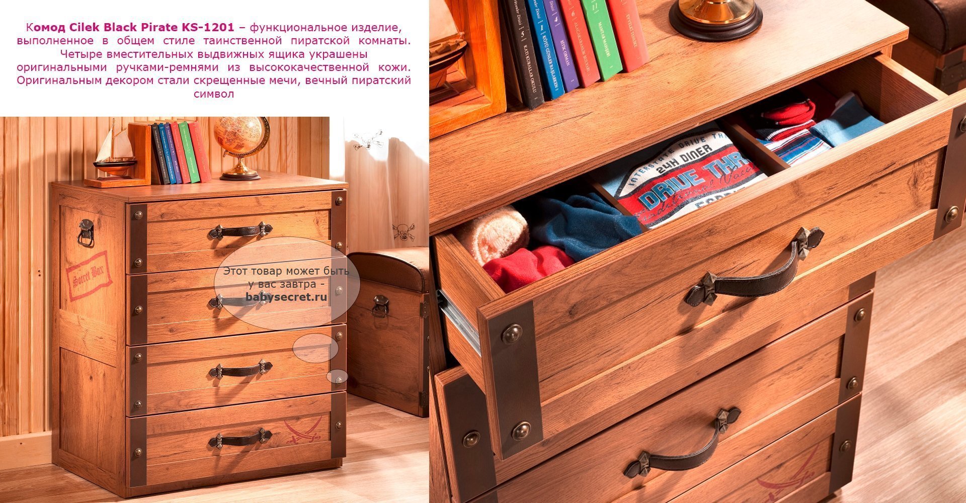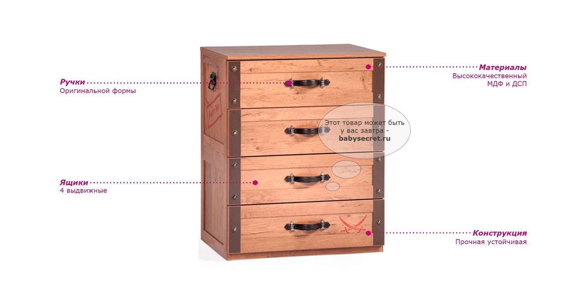 Содержание большого гардероба в порядке перестанет быть проблемой благодаря четырем широким вместительным ящикам комода Black Pirate. Все детские комоды сертифицированы и допущены к продажам и использованию на территории России. Одним из приоритетов в производстве мебели для детей является экологическая чистота материала и его безопасность для здоровья ребенка.