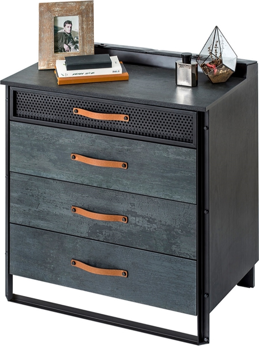 Комод имеет четыре ящика. Верхний отличается от остальных. Он меньших размеров и выполнен из металла в виде сетки. Нижние ящики отлично подходят для хранения белья и вещей. А верхний – для разных мелочей, которые всегда должны быть под рукой.