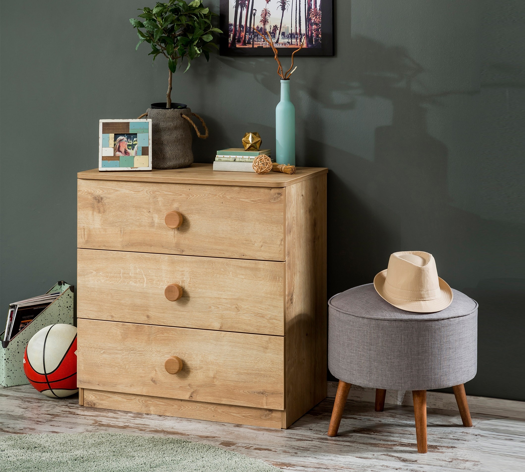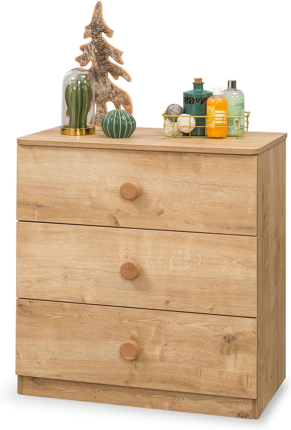 Такой комод может быть использован в качестве подставки под телевизор, красивую вазу, фотографии, сувениры, какой-либо декор. Подойдет для спальни, детской, прихожей, гостиной. Его смело можно назвать универсальным изделием.Модель имеет три вместительных выдвигающихся ящика. Каждый из которых имеет круглую ручку в тон изделию. Точно подобранный цвет делает ручки с ящиками единым целым. Здесь можно хранить белье, одежду, множество других нужных вещей.Модель выполнена из ламинированного ДСП высокого качества. Поэтому изделие прослужит долгие годы. При этом, материал полностью безвреден и может быть использован даже для детской комнаты. Ручки выполнены из пластика под дерево.