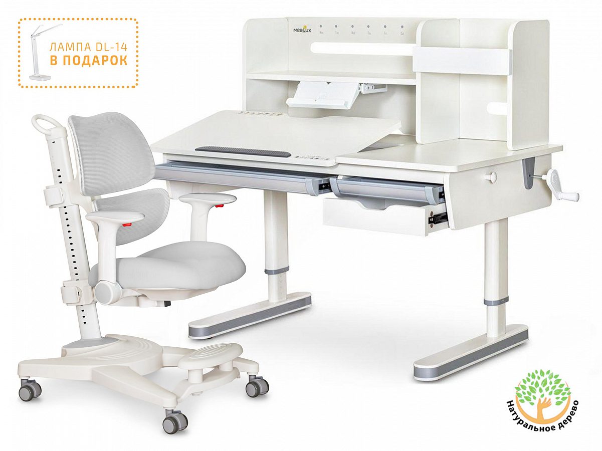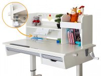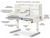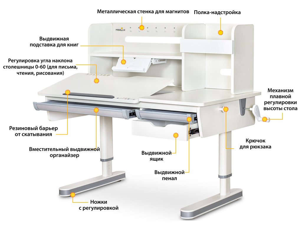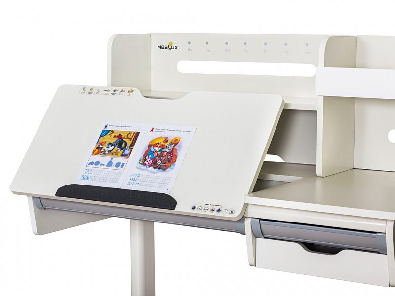 Приятные особенности:Под столешницей размещается вместительный органайзер, пенал для канцтоваров и деревянный выдвижной ящик для хранения тетрадей. Такое разнообразие функциональных элементов стола поможет организовать рабочее пространство вашего ребенка.Металлическую стенку полки-надстройки можно использовать для записей и заметок, прикрепляя их магнитами согласно дням недели.Высота стола регулируется с помощью механической ручки, что позволяет с легкостью устанавливать парту в соответствии с ростом Вашего ребёнка.Столешница меняет угол наклона до 60 градусов с помощью газлифта, что позволяет подобрать положения для чтения, письма, рисования. Для безопасности регулировки детьми на краю столешницы предусмотрен специальный промежуток.У стола есть многофункциональная полка-надстройка, которая комплектуется выдвижной металлической подставкой для книги. Подставка легко изменяет угол наклона и ее можно скрыть при необходимости.На столешнице предусмотрен прорезиненный барьер от скатывания предметов во время занятий.С обеих сторон стола размещены держатели для портфеля.