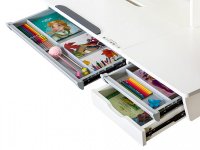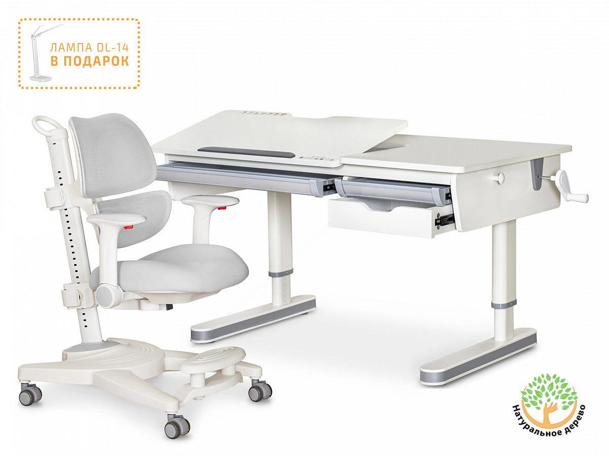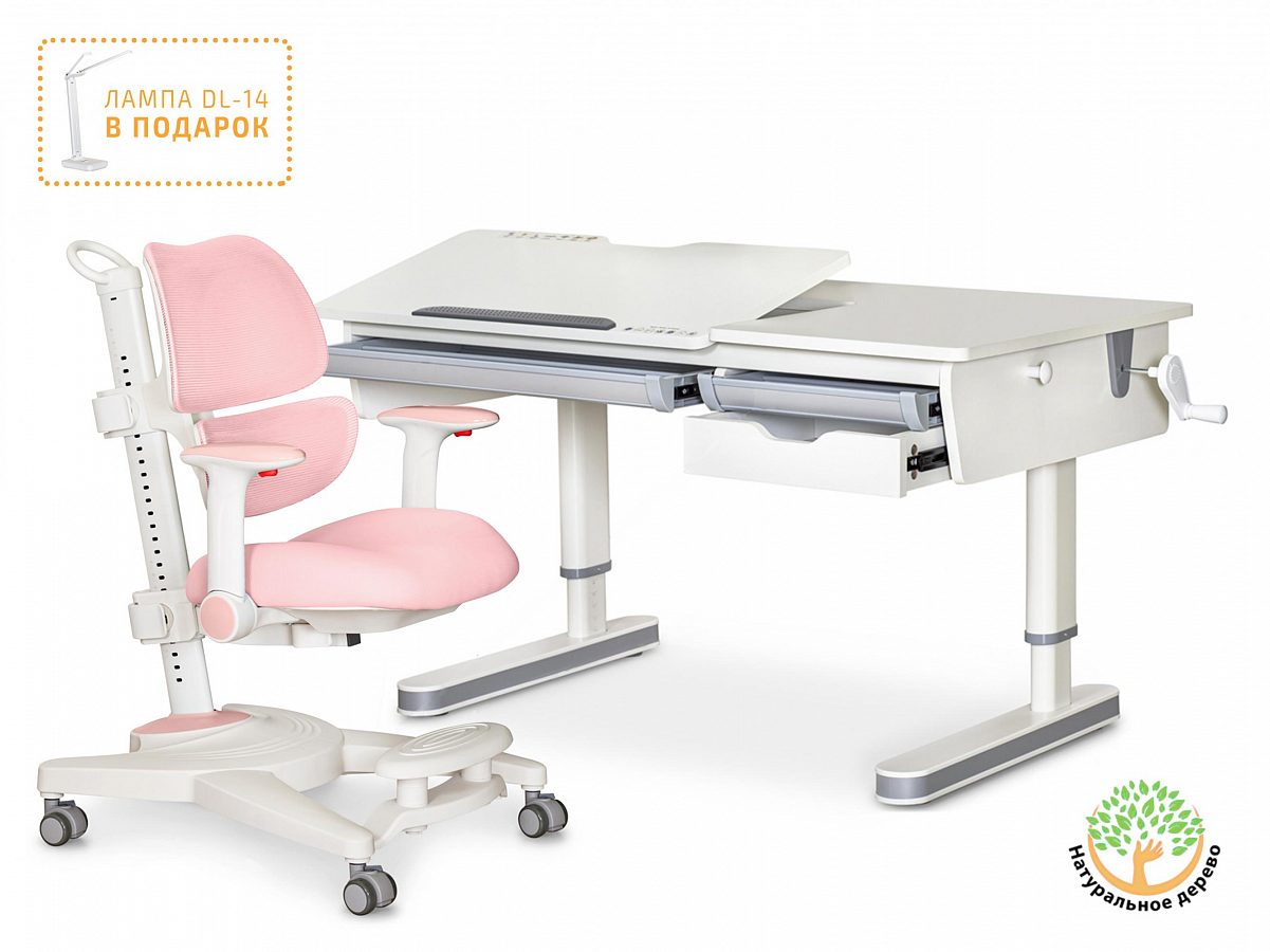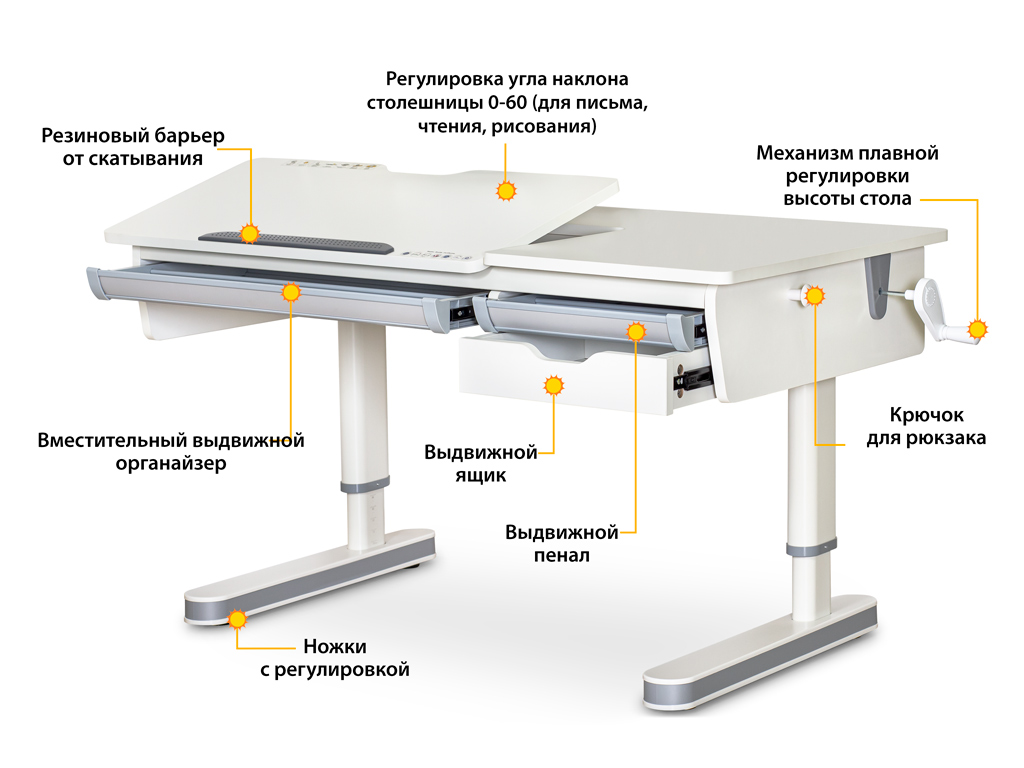 Приятные особенности: Под столешницей размещается вместительный органайзер, пенал для канцтоваров и деревянный выдвижной ящик для хранения тетрадей. Такое разнообразие функциональных элементов стола поможет организовать рабочее пространство вашего ребенка.Высота стола регулируется с помощью механической ручки, что позволяет с легкостью устанавливать парту в соответствии с ростом ребенка.Столешница меняет угол наклона до 60 градусов с помощью газлифта, что позволяет подобрать положения для чтения, письма, рисования. Для безопасности регулировки детьми на краю столешницы предусмотрен специальный промежуток.С обеих сторон стола размещены держатели портфеля.