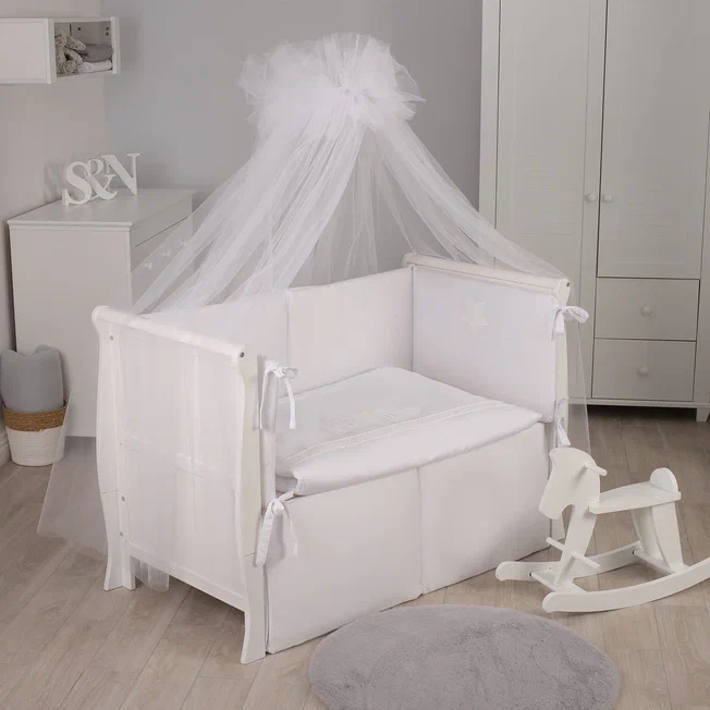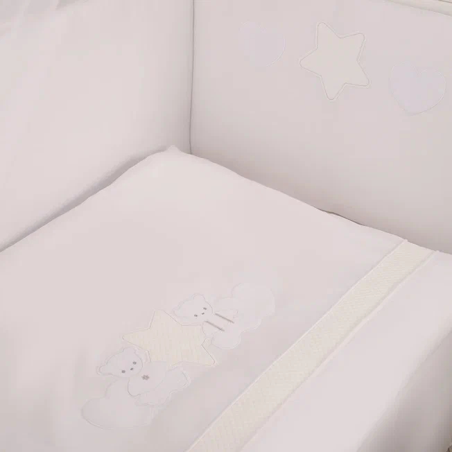 Приятные особенности:Комплект постельного белья Lepre Bella - это классический комплект из 100%-го хлопка. Имеет нежные цвета, симпатичную аппликацию с милыми животными и высокое качество изделия. В комплекте — 6 предметов, которые нужны, чтобы полностью укомплектовать кроватку. Мягкие бортики берегут малыша от сквозняков и создают нужный уют для сна. Бортик включает две независимых части с возможностью отстегивать фронтальную и контактировать визуально с родителями. Комплект подходит для кроватей с размером спальных мест - 120x60 см и 125x65 см. Чехлы бортиков застегиваются на молнию, съемные. Одеяло очень легкое, воздушное, гипоаллергенное.