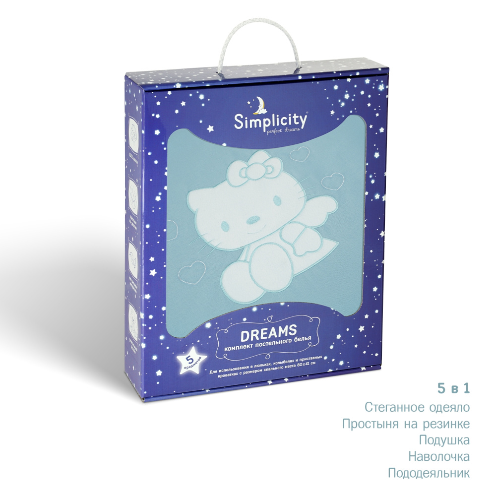 Основные характеристики:Simplicity Dreams — это комплект детского постельного белья высочайшего качества для использования в люльках, колыбелях и приставных кроватках с размером спального места 80х41 см.Комплект включает в себя 5 предметов: стеганное одеяло с пододеяльником, удобную простыню на резинке и подушку со съёмной наволочкой.Ткань детского комплекта на 100% состоит из натурального хлопка: подушка и одеяло изготовлены из бязи с мягким наполнителем, все съемные элементы из износостойкого сатина. Важно, что эти легкие и дышащие материалы гипоаллергенны, и не провоцируют раздражения и опрелостей на коже малыша.Комплект Simplicity Dreams — это ещё и отличный вариант подарка на выписку из роддома, смотрины или крещение новорожденного! Стильный дизайн упаковки, пастельные расцветки и тончайшие вышивки не оставят равнодушной ни одну маму. Качественные материалы прослужат длительное время, они станут залогом уюта и комфорта, помогая малышам видеть только сладкие сны.