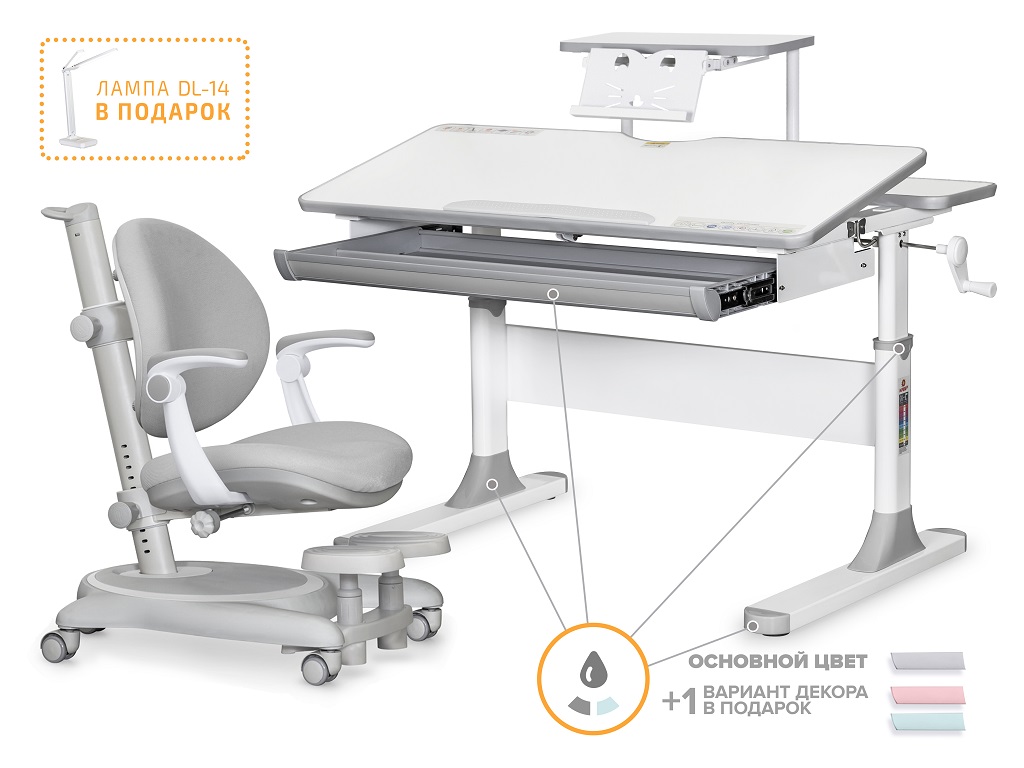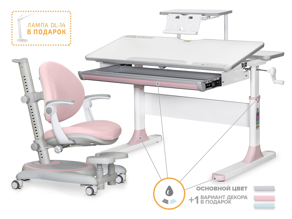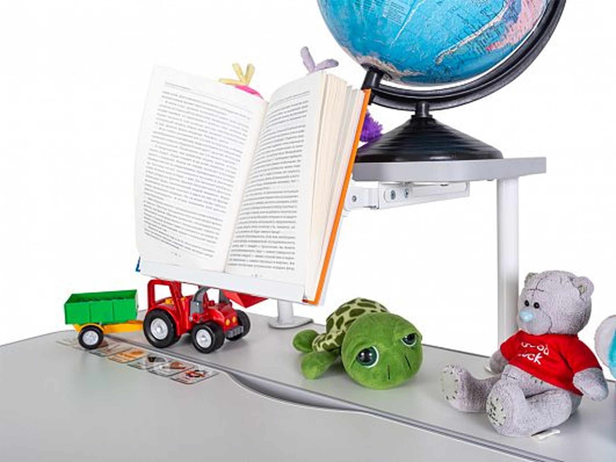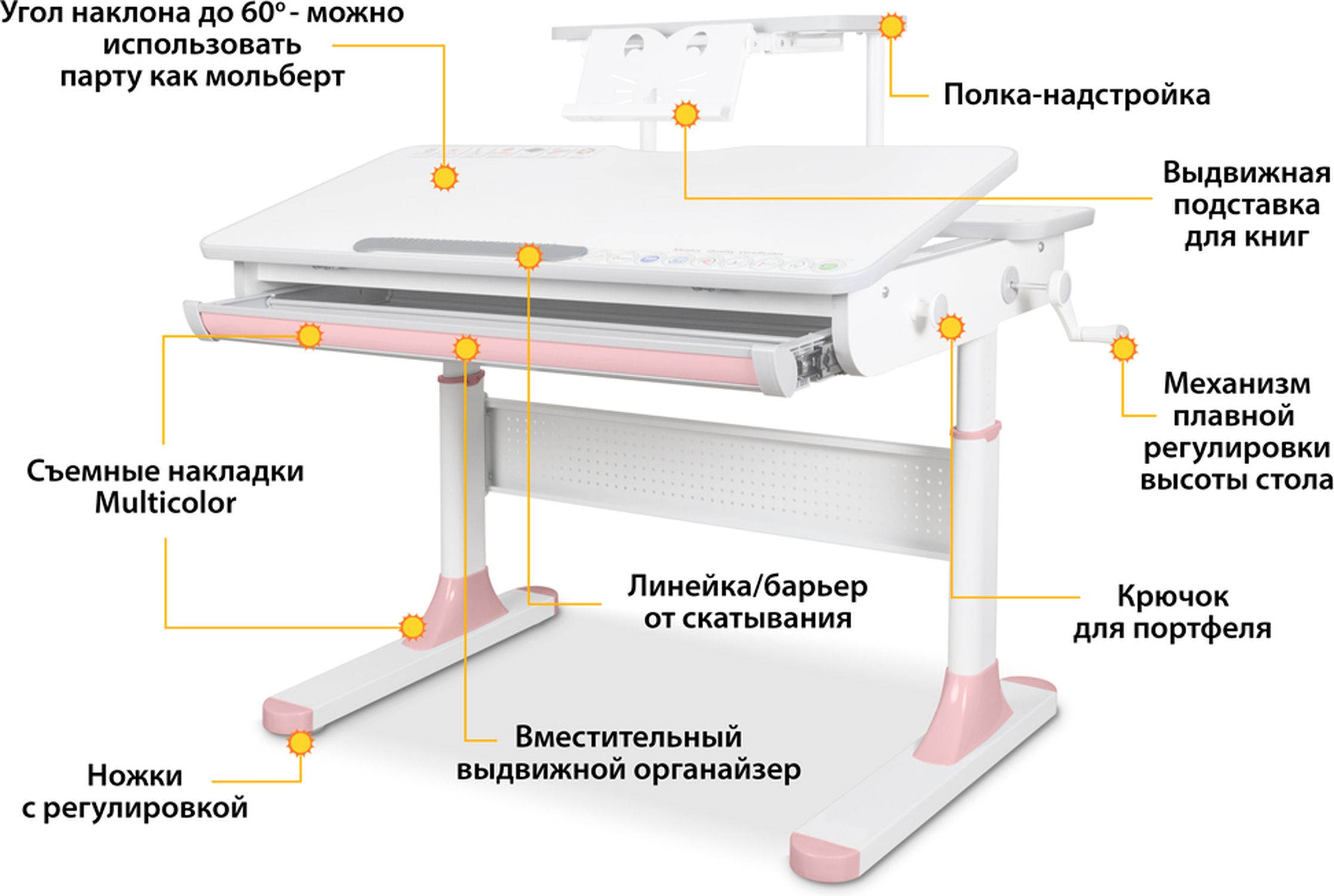 Приятные особенности:Детский стол-парта Mealux Edmonton Multicolor - эргономичная, регулируемая по высоте школьная парта для детей. Белый каркас дополнен цветными вставками розового, серого и голубого оттенков. Накладки всех цветов уже включены в комплект, меняйте их на Ваш вкус, сочетая с обстановкой. На наклонной поверхности удобно писать, читать книги, рисовать, используя вместо мольберта. Чтобы книги и тетради не скатывались вниз, столешница дополнена противоскользящим барьером. Снизу размещен компактный выдвижной пенал-органайзер для канцтоваров. А сверху располагается невысокая надстройка с полочками, металлической доской и закрытым шкафчиком. На доску с помощью магнитных держателей крепятся стикеры, «напоминалки» и различные заметки, а также есть отверстия для установки подвесных пеналов. Шкафчик закрывается оригинальной металлической дверцей с прорезью в форме лапки. Дверца открывается вверх. Выдвижная подставка позволит расположить книгу на оптимальном расстоянии на уровне глаз. Для портфеля предусмотрен крепкий металлический крючок. Широкие опоры оснащены накладками для выравнивания.