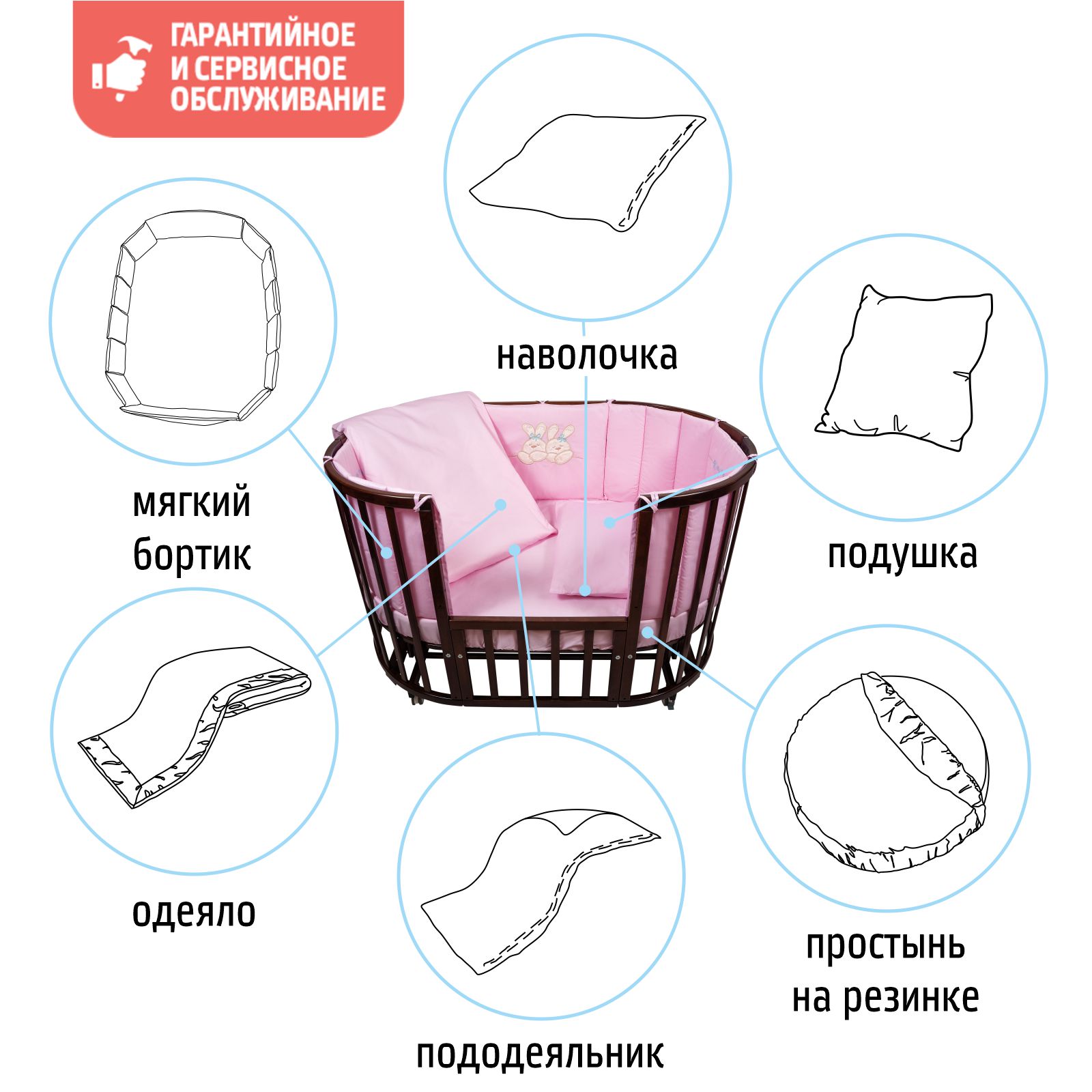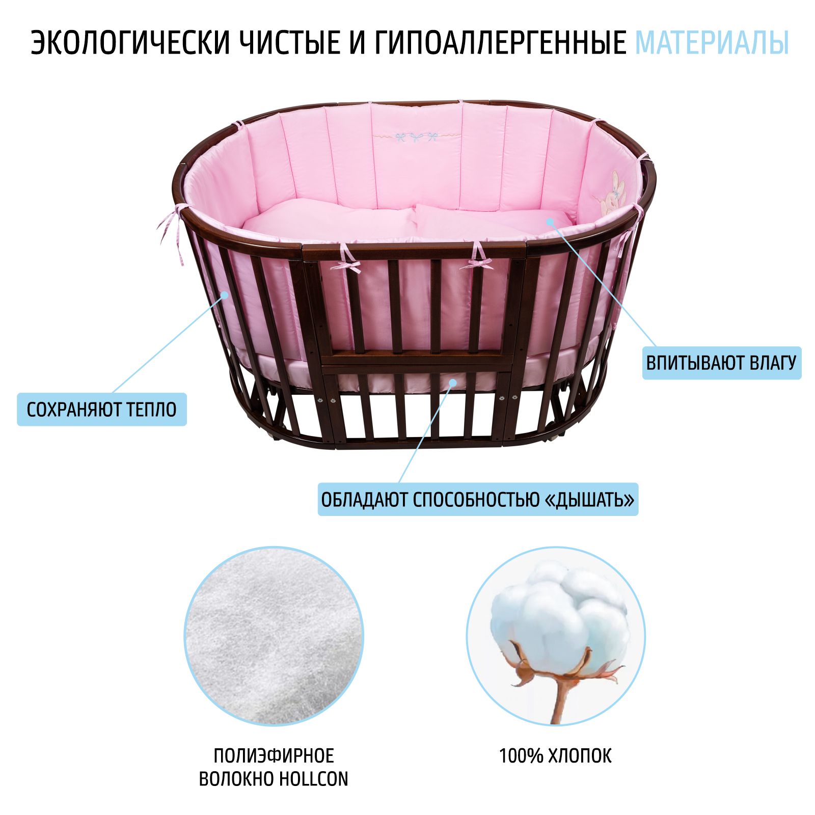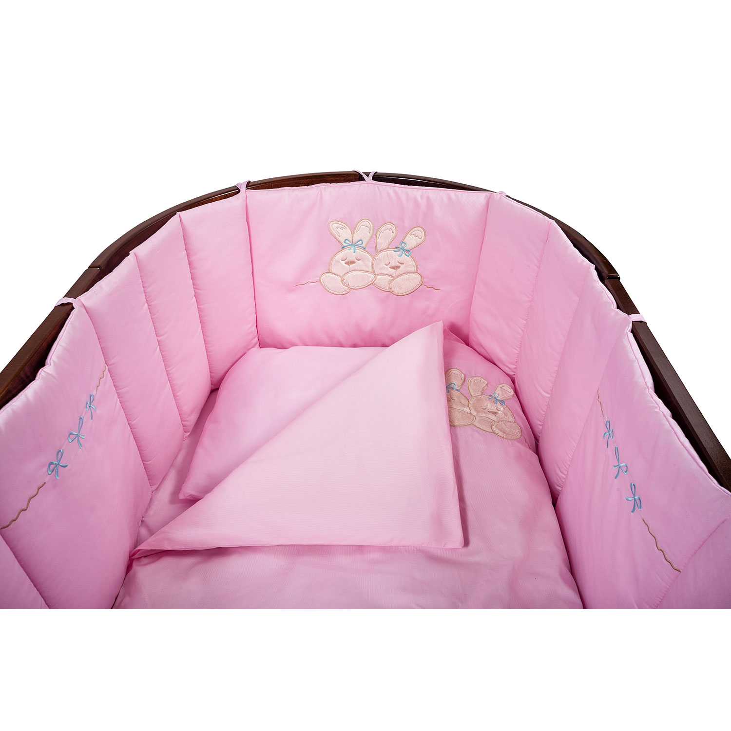 Приятные особенности :Родители часто называют любимого младенца ласковым словом «зайчик». Именно этот нежный образ и вдохновил дизайнеров на создание данного комплекта: его пододеяльник и приходящаяся на изголовье часть бортика украшены изысканной вышивкой, изображающей двух спящих зайчат. Так же мило и трогательно будет посапывать в своей кроватке и ваш малыш, окруженный уютом и красотой постельных принадлежностей из этого набора.Комплект состоит из защитных бортиков, практичной простыни на резинке, пододеяльника и наволочки из чистого хлопка, а также подушки и одеяла с наполнителем из бамбука. Все материалы натуральные, экологически чистые и не вызывают аллергии, что так важно при выборе постельного белья для самых маленьких. В сочетании с безукоризненным качеством пошива и прекрасным дизайном эти преимущества делают комплект замечательным вариантом для оформления спального места в детской комнате.