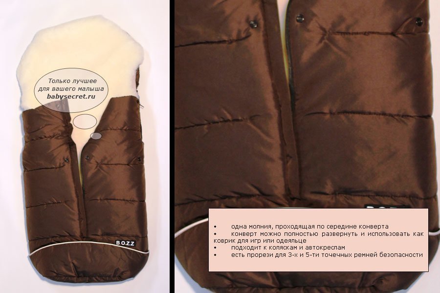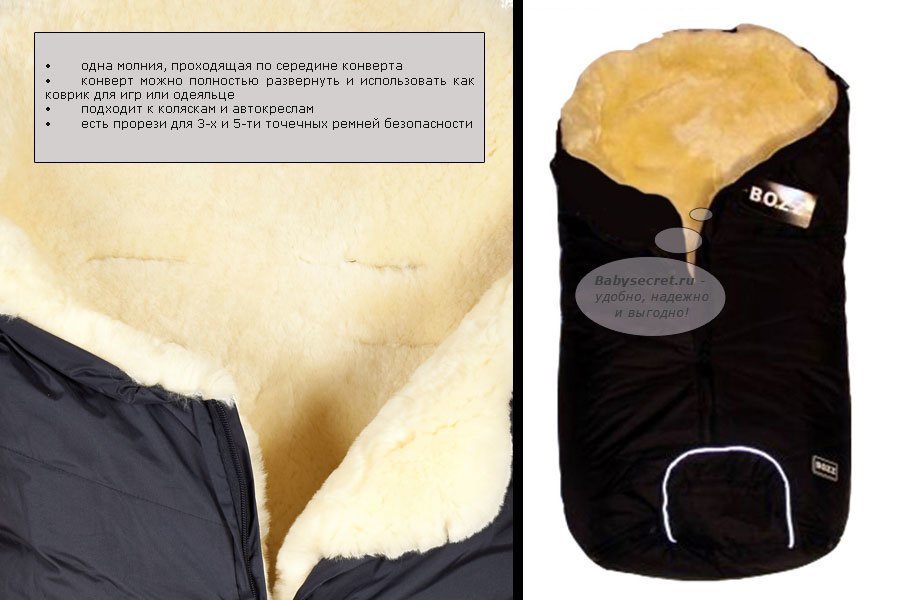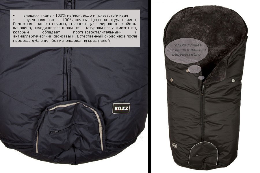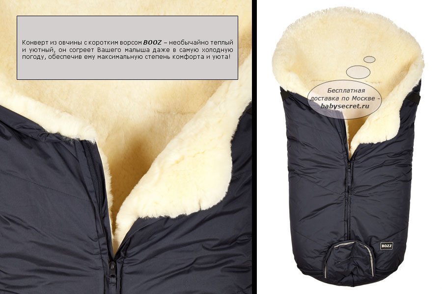 Приятные особенности: Конверт из овчины с коротким ворсом BOZZ необычайно теплый и уютный, он согреет Вашего малыша даже в самую холодную погоду, обеспечив ему максимальную степень комфорта и уюта! Внутренняя сторона конверта выполнена из овчины с коротким ворсом. Удобная застежка-молния позволяет полностью расстегивать конверт, облегчая тем самым процесс одевания его на ребенка. Конверт из овчины BOZZ– лучший выбор всех современных родителей.