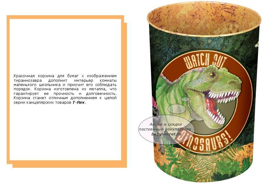Приятные особенности корзины для бумаг Spiegelburg T-Rex 21032:красочная корзина для бумаг с изображением тираннозавра дополнит интерьер комнаты маленького школьника и приучит его соблюдать порядок. Корзина изготовлена из металла, что гарантирует ее прочность и долговечность. Корзина станет отличным дополнением к целой серии канцелярских товаров T-Rex.