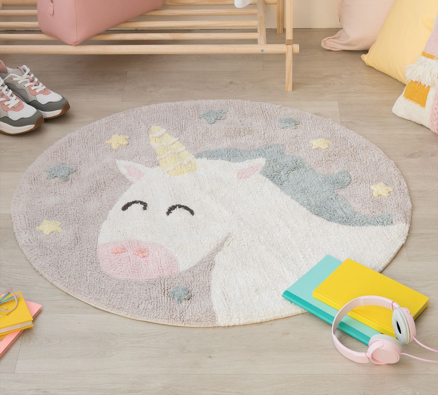 Приятные особенности:Один из самых популярных персонажей для девочек – милый единорог обязательно понравится вашей малышке и сделает ее детскую еще более комфортной и уютной. Коврик круглой формы в мягких пастельных тонах идеально подходит для дизайна детских комнат. Вы можете разместить его в центре комнаты или выделить зону сна или игр. Ковер от Lorena Canals - очень полезная вещь в доме! Ребёнку будет намного комфортнее ползать, сидеть и играть на теплом, мягком, красивом ковре, а взрослые смогут добавить своей комнате уюта и комфорта. Изделия Lorena Canals отвечают всем стандартам качества и безопасности товаров для детей. При их изготовлении не используются токсичные красители и химические вещества. Ковры из хлопка можно стирать в стиральной машинке в режиме деликатной стирки и сушить в барабанной сушке.
