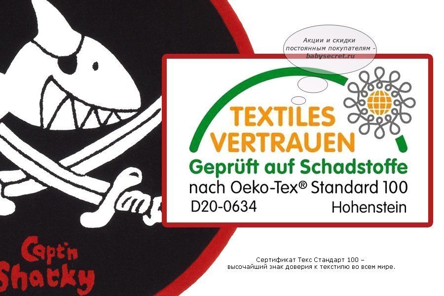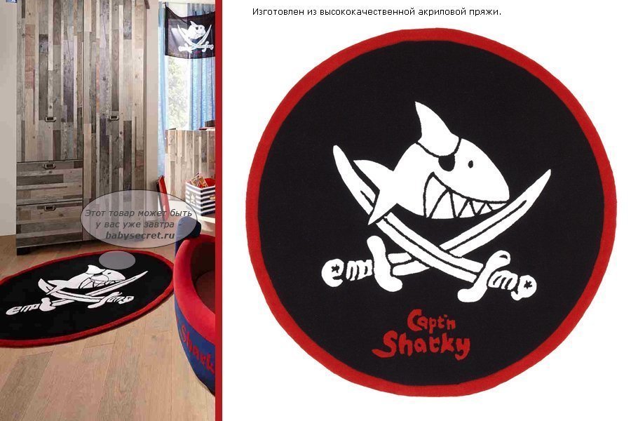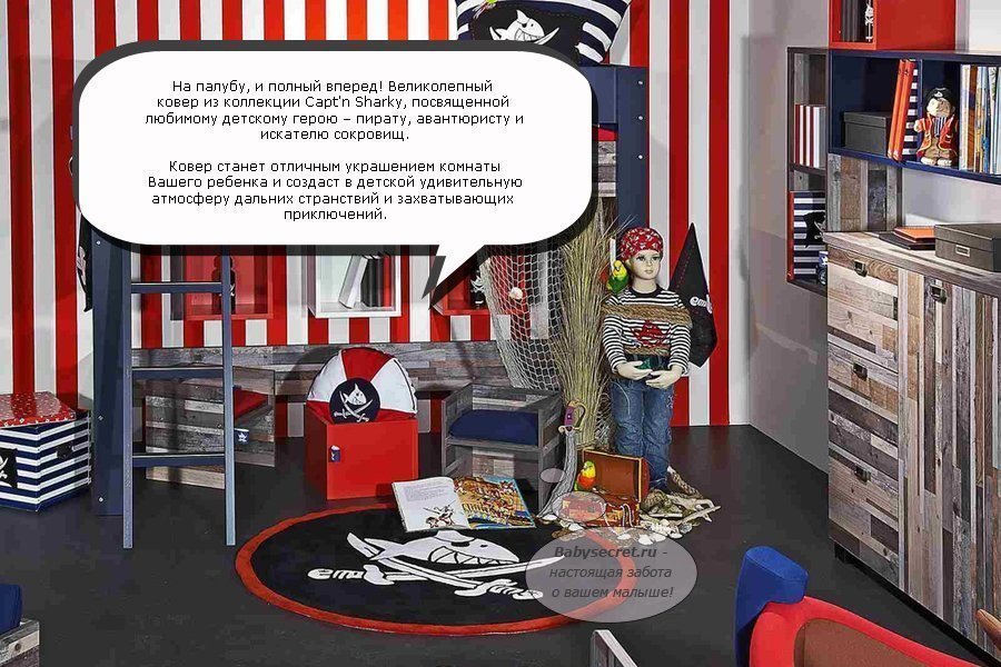 Приятные особенности ковра Spiegelburg Capt'n Sharky:на палубу, и полный вперед! Великолепный ковер из коллекции Capt'n Sharky, посвященной любимому детскому герою – пирату, авантюристу и искателю сокровищ. Ковер станет отличным украшением комнаты Вашего ребенка и создаст в детской удивительную атмосферу дальних странствий и захватывающих приключений. Благодаря высококачественной ручной работе и использованию акриловых волокон высочайшего качества вы будете поражены его высокими функциональными характеристиками. Объемная вышивка с филигранными контурами делает рисунок по-особенному живым и выразительным. При производстве ковра использовано специальное антибактериальное покрытие, содержащее хитозан, и нейтрализующие неприятные запахи волокна. Сертификат Текс Стандарт 100 – высочайший знак доверия к текстилю во всем мире.