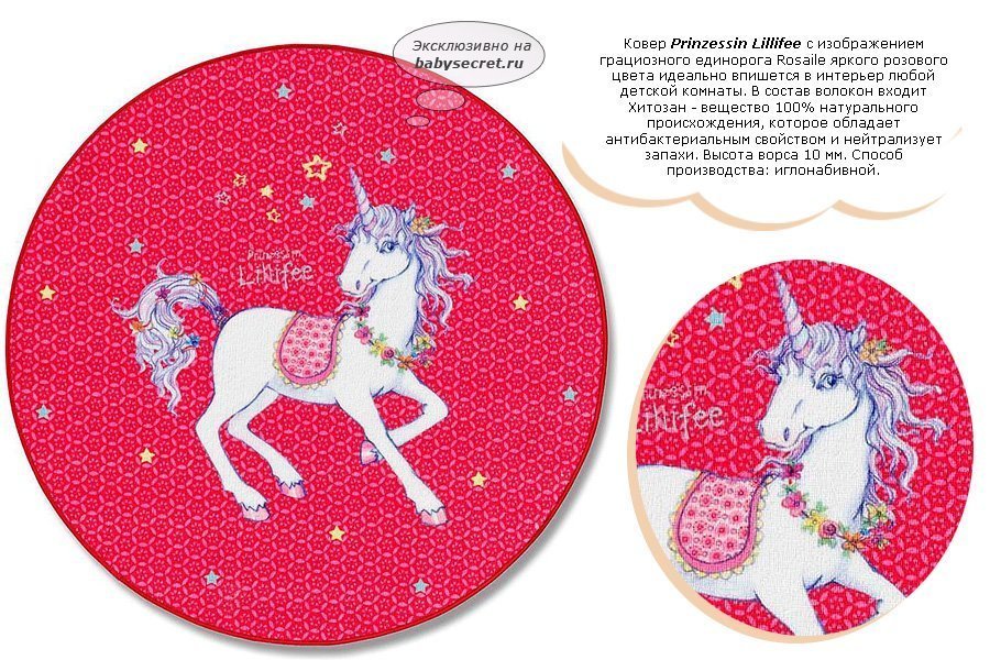 Приятные особенности ковра Spiegelburg Prinzessin Lillifee 103-100R/130R:ковер Prinzessin Lillifee с изображением грациозного единорога Rosaile яркого розового цвета идеально впишется в интерьер любой детской комнаты.Всостав волокон входит Хитозан - вещество 100% натурального происхождения, которое обладает антибактериальным свойством и нейтрализует запахи. Высота ворса 10 мм. Способ производства: иглонабивной. Сертификат Текс Стандарт 100 – высочайший знак доверия к текстилю во всем мире.