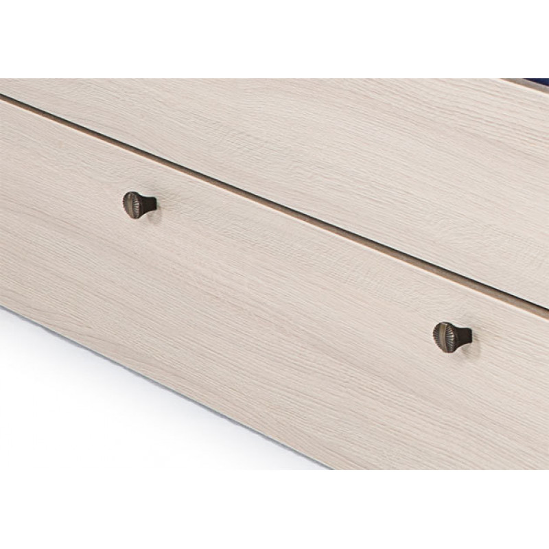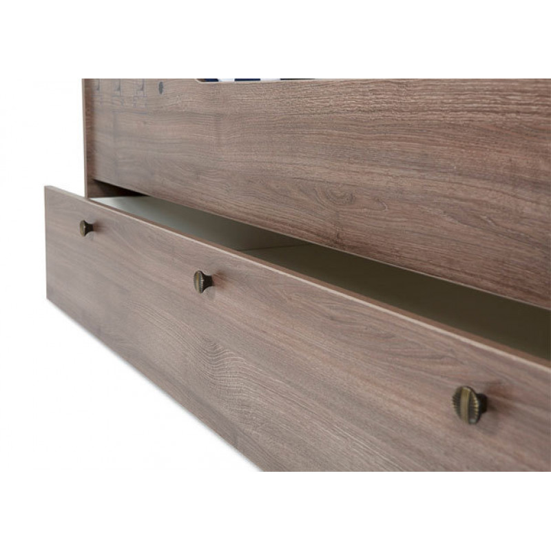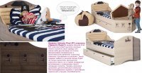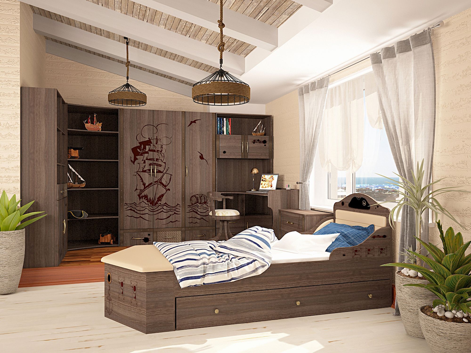 Приятные особенности кровати Pirat: кровать имеет низкое изножье, для тех, кто не хочет даже думать о том с какой стороны сесть на кровать и для тех, кто не хочет видеть спинку, смотря телевизор. Декорирована интересными и оригинальными деталями пиратской тематики и вставками из экокожи. Такой предмет мебели в комнате юноши будет не только выполнять функционал спального места, но и станет интересным дополнением и украшением самого интерьера комнаты. Кровать возможно дополнить дополнительным спальным местом/выдвижным ящиком и приставным ящиком для игрушек.