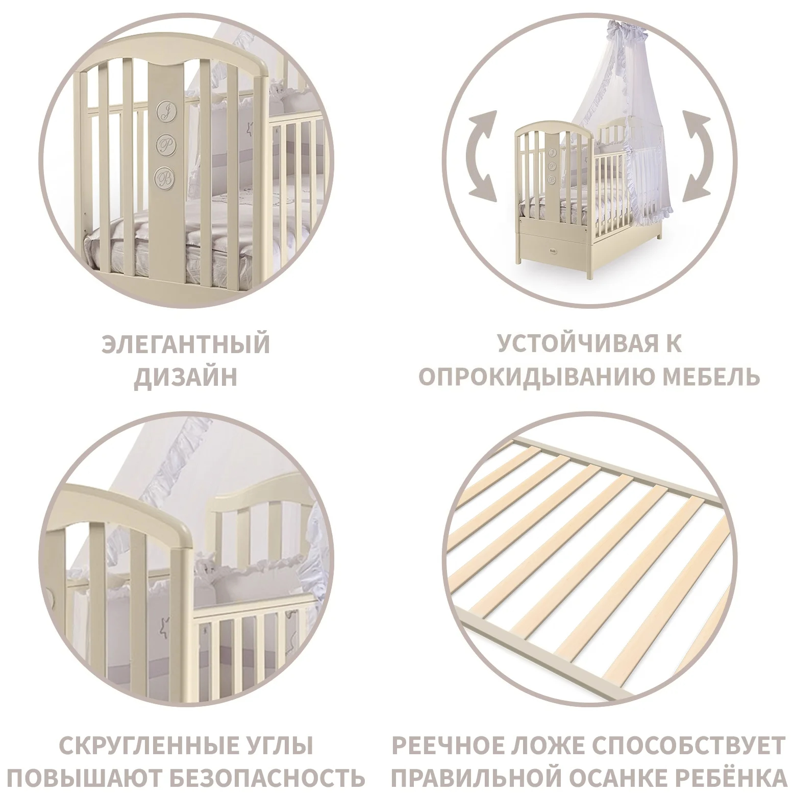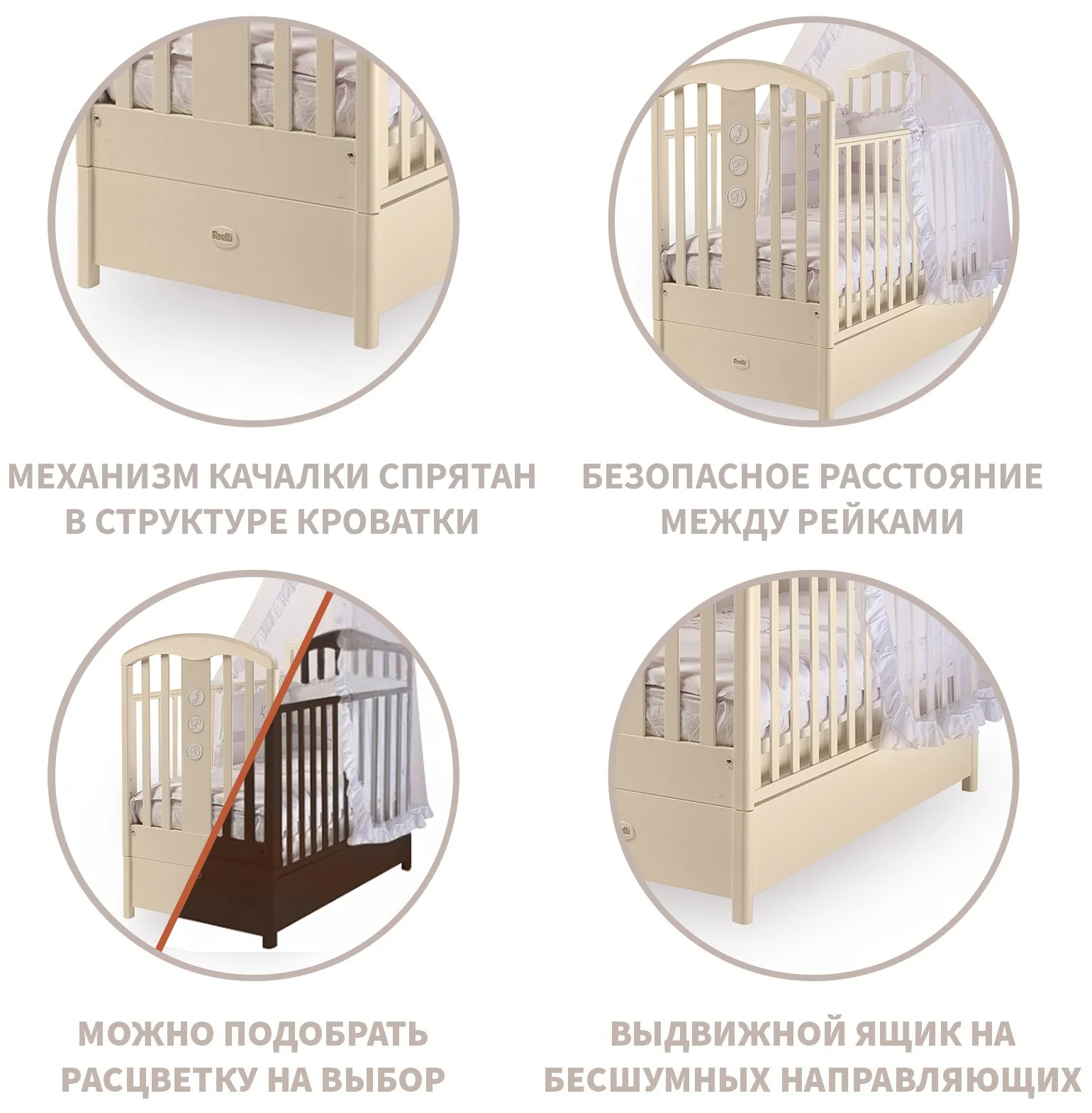 Приятные особенности:Детская кроватка FMS Elegance органично впишется в любой интерьер. Эта кроватка изготовлена итальянским производителем Feretti и украшена нежной аппликацией.FMS (Feretti Mistery Sistem) система продольного качания - один из эксклюзивных патентов компании. Благодаря особому устройству эта система помогает мягко укачивать детей, но при этом впервые можно полностью спрятать механизм качалки в структуре кроватки.