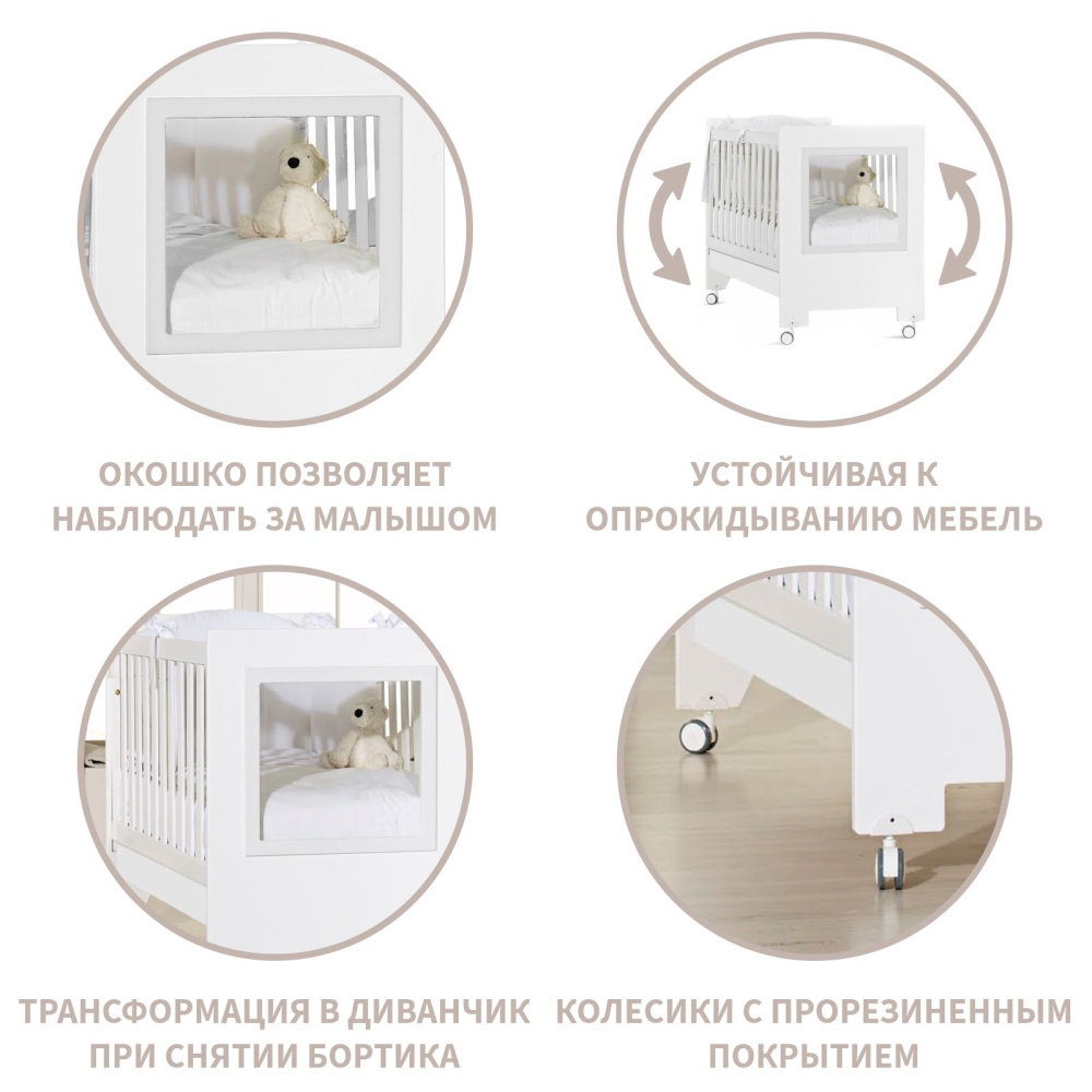 Приятные особенности:Кроватка детская FERETTI Le Chic - классическая, изготовлена из ценных пород древесины, МДФ, качественной фурнитуры, что говорит о ее безопасности, долгом сроке службы и эксплуатации. Два уровня положения ложа позволяет подобрать подходящий, в зависимости от возраста ребенка. Дно спального места - реечное, оно обеспечивает надежное сцепление с матрасом. Одна стенка регулируется по высоте в двух положениях и полностью снимается, благодаря чему кроватка превращается в удобный детский диванчик. Сквозь окно в боковине удобно наблюдать за малышом в кроватке. Под днищем кроватки расположен выдвижной ящик на бесшумных направляющих для постельного белья или игрушек. Съёмные, самоцентрирующиеся колеса снабжены 2 тормозами. Данная модель представлена в нескольких пастельных цветовых решениях, поэтому вы сможете выбрать подходящую комбинацию именно вашей детской.