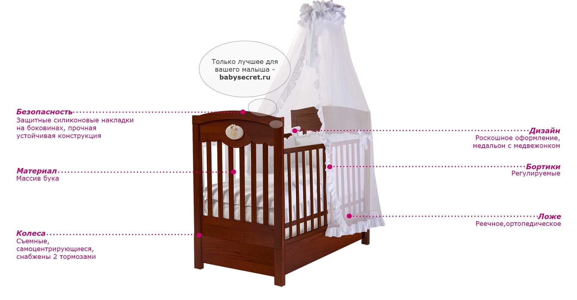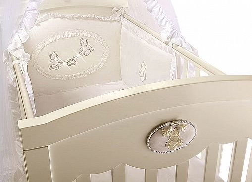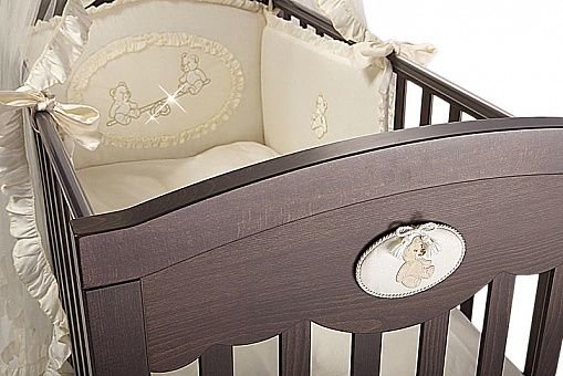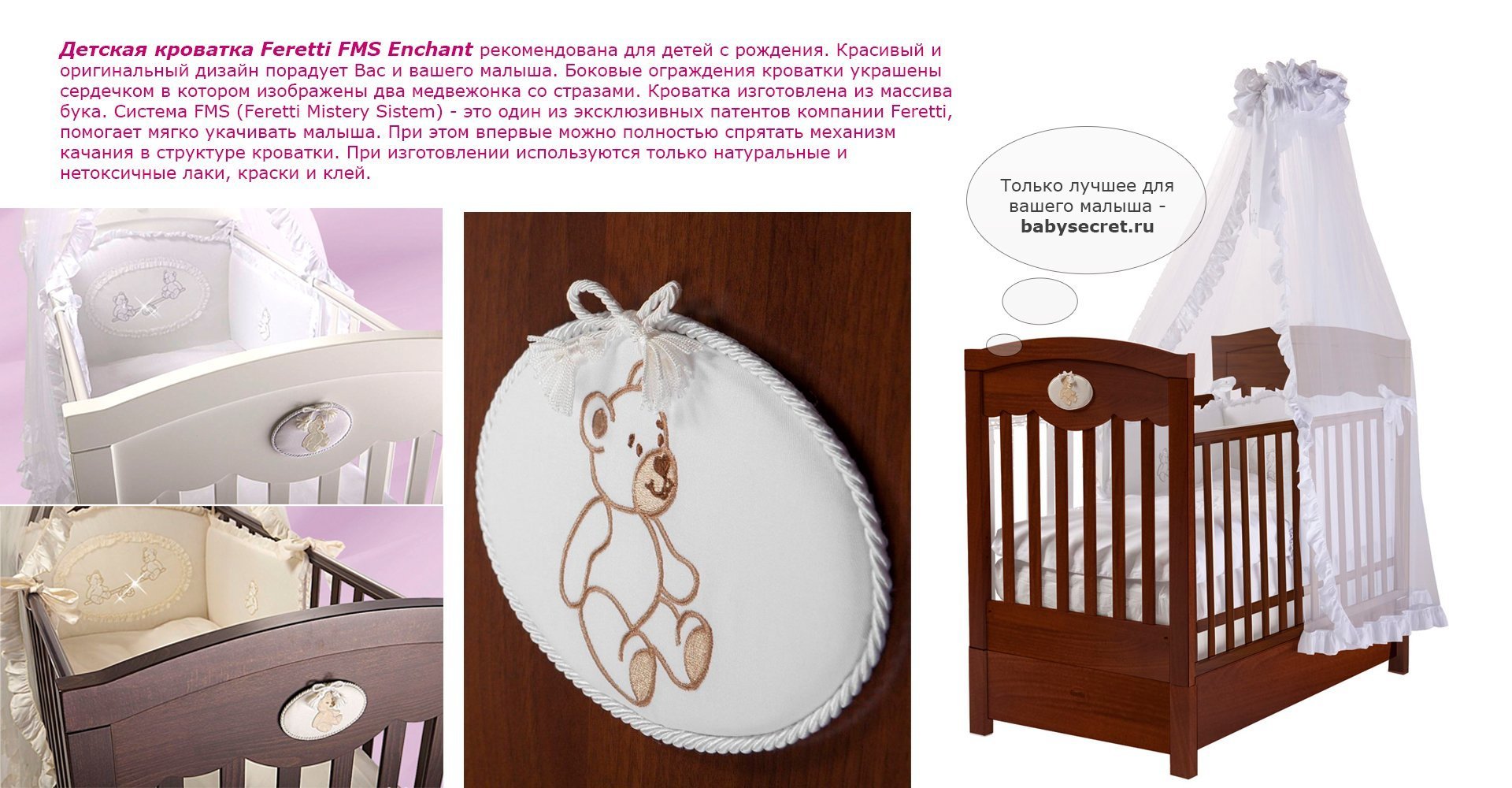 Приятные особенности детской кроватки Feretti FMS Enchant:рекомендована для детей с рождения. Красивый и оригинальный дизайн порадует Вас и вашего малыша.Боковые ограждения кроватки украшены сердечком в котором изображены два медвежонка со стразами. Кроватка изготовлена из массива бука. Система FMS(Feretti Mistery Sistem) - это один из эксклюзивных патентов компании Feretti, помогает мягко укачивать малыша. При этом впервые можно полностью спрятатьмеханизм качания в структуре кроватки. При изготовлении используются только натуральные и нетоксичные лаки, краски и клей.