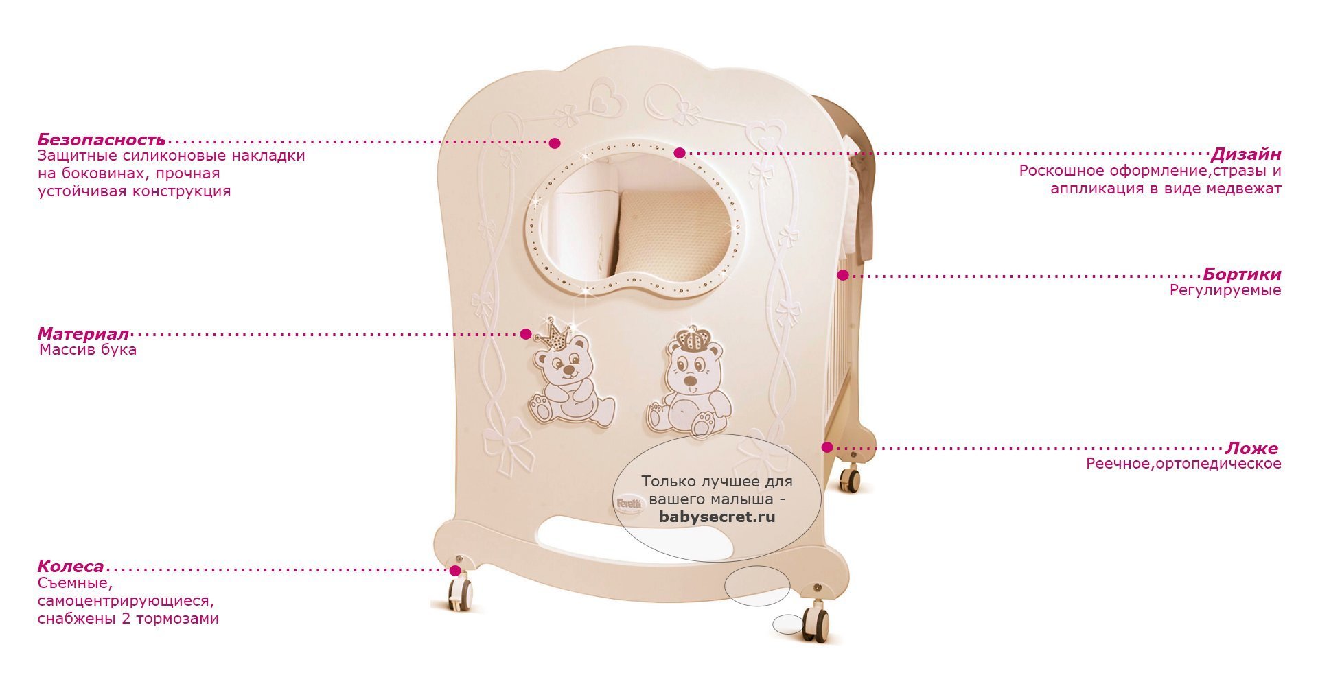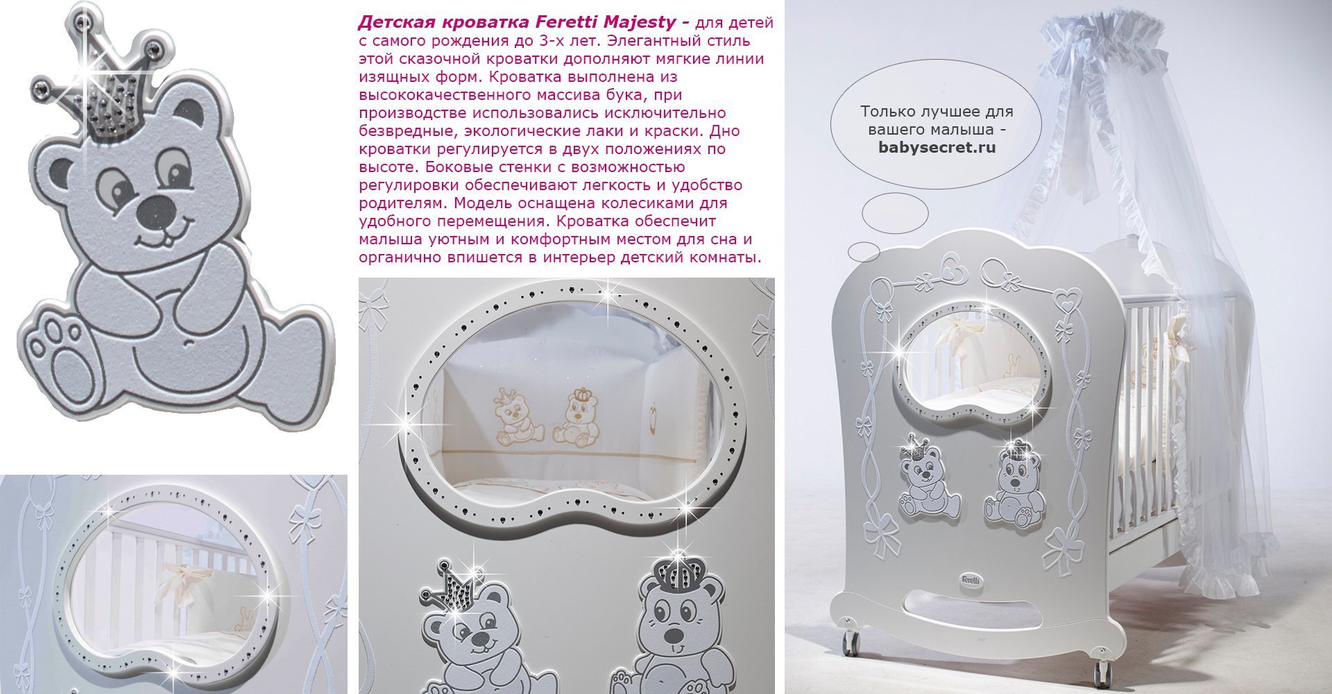 Приятные особенности детской кроватки Feretti Majesty: для детей с самого рождения до 3-х лет. Элегантный стиль этой сказочной кроватки дополняют мягкие линии изящных форм. Кроватка выполнена из высококачественного массива бука, при производстве использовались исключительно безвредные, экологические лаки и краски. Дно кроватки регулируется в двух положениях по высоте. Боковые стенки с возможностью регулировки обеспечивают легкость и удобство родителям. Модель оснащена колесиками для удобного перемещения. Кроватка обеспечит малыша уютным и комфортным местом для сна и органично впишется в интерьер детский комнаты.