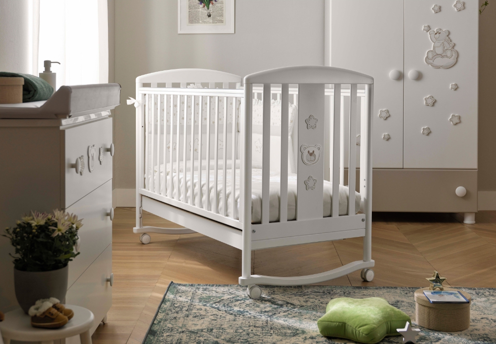 Приятные особенности детской кроватки PaliLittle Royal Baby:Детская кроватка Pali Little Royal Baby с аппликацией на фасаде в виде сказочного медвежонка и звездочек. Белый цвет в комбинации с серыми элементами придаст очаровательность и элегантность комнате маленького владельца. Кроватка комплектуется колесами, благодаря которым ее легко передвигать ко комнате. Колеса имеют стояночный тормоз для фиксирования на одном месте. Стильный элегантный дизайн, а так же высокое качество используемых материалов наполнят комнату атмосферой уюта и тепла. Особенности кроватки делают ее не только красивым, но и удобным и функциональным предметом интерьера детской комнаты.