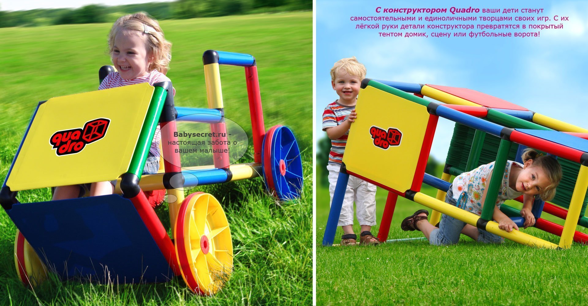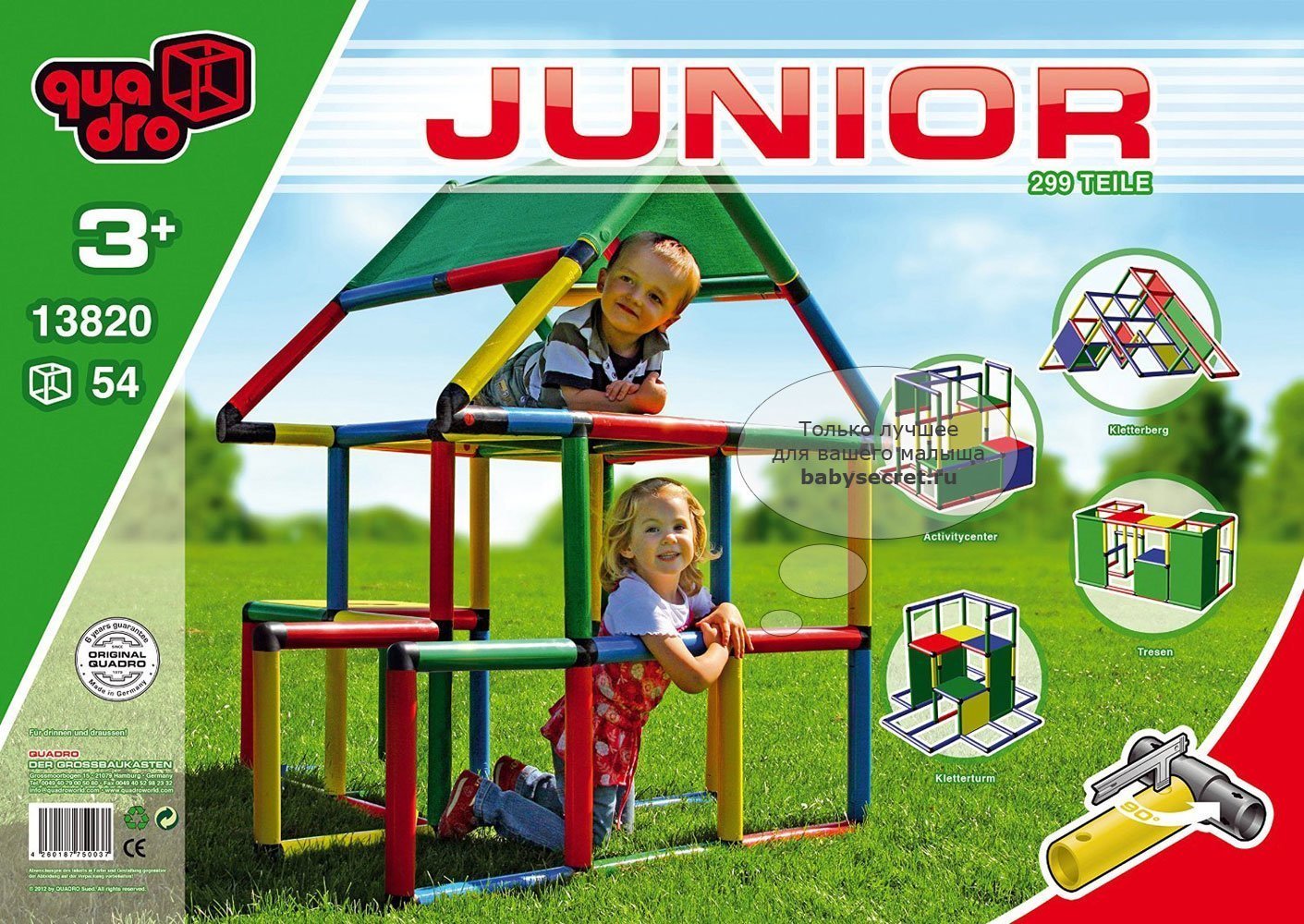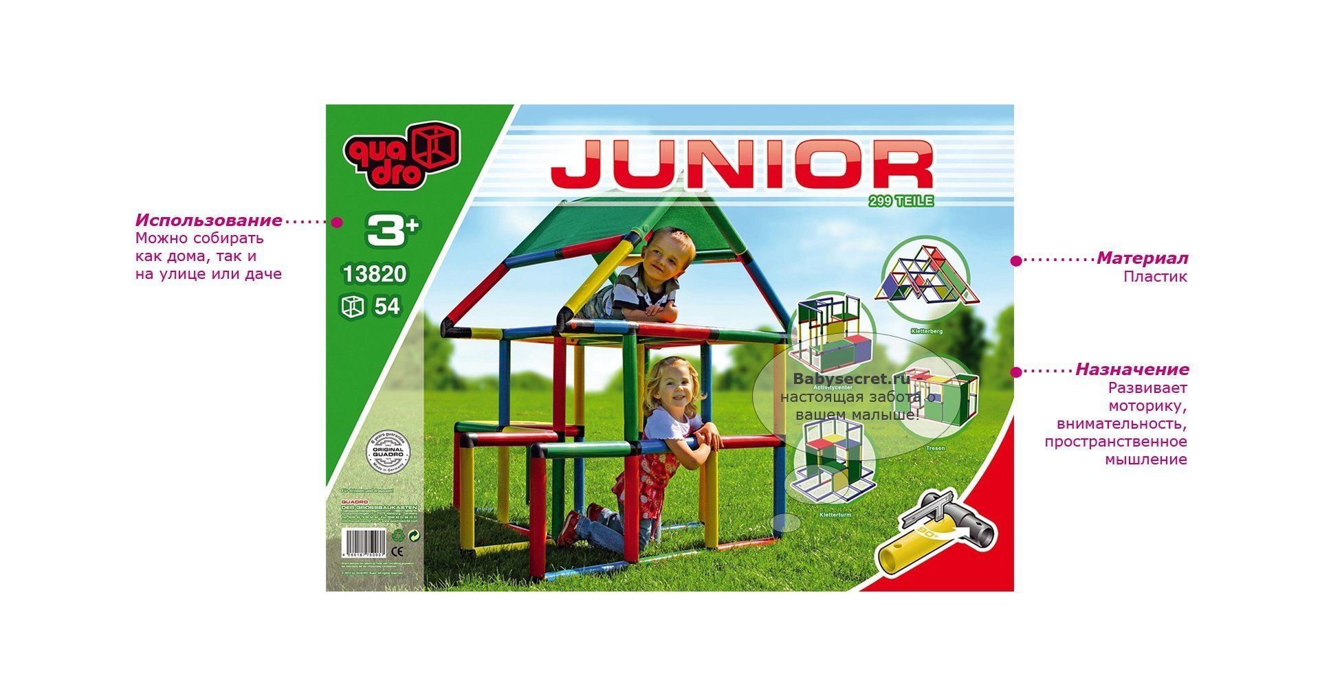 Приятные особенности крупногабаритного конструктора Quadro Junior 299 деталей 13820:в чужую голову не залезешь. И это особенно обидно, когда дело касается собственных детей. Этот конструктор не научит вас читать мысли, однако их ход вы теперь сможете легко проследить. Потому что с Junior Quadro ваши дети становятся самостоятельными и единоличными творцами своих игр. С их лёгкой руки 299 деталей комплекта превратятся в покрытый тентом домик, сцену, футбольные ворота, горку (которая с вашей помощью может стать водной). Впрочем, почти три сотни деталей вряд ли сильно ограничат детскую фантазию, а потому запасайтесь поп-корном, уютным креслом и усаживайтесь неподалёку, чтобы воочию лицезреть все конструкторско-исторические перипетии детской игры. Конструктор Quadro можно использовать как в помещении, так и на улице круглый год!