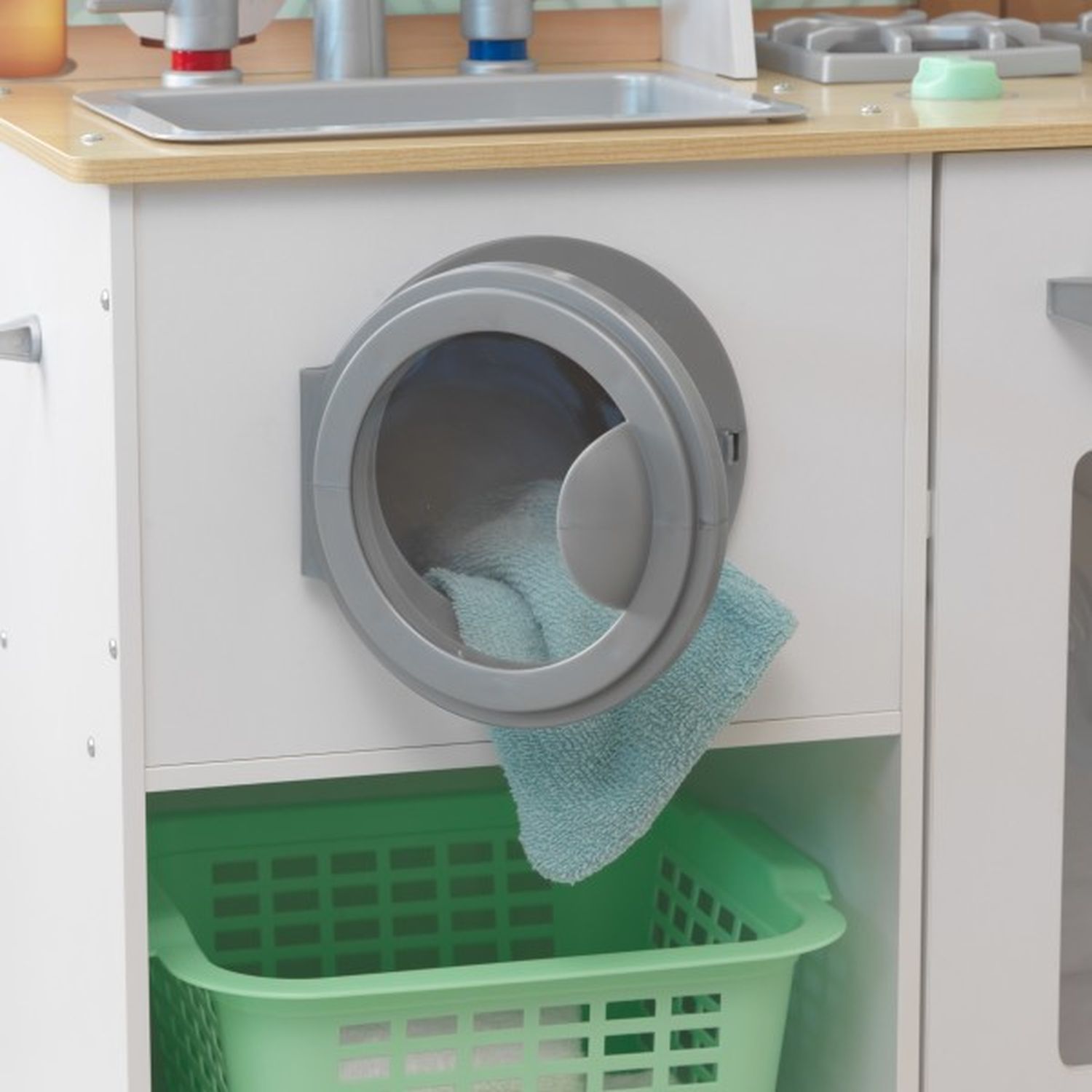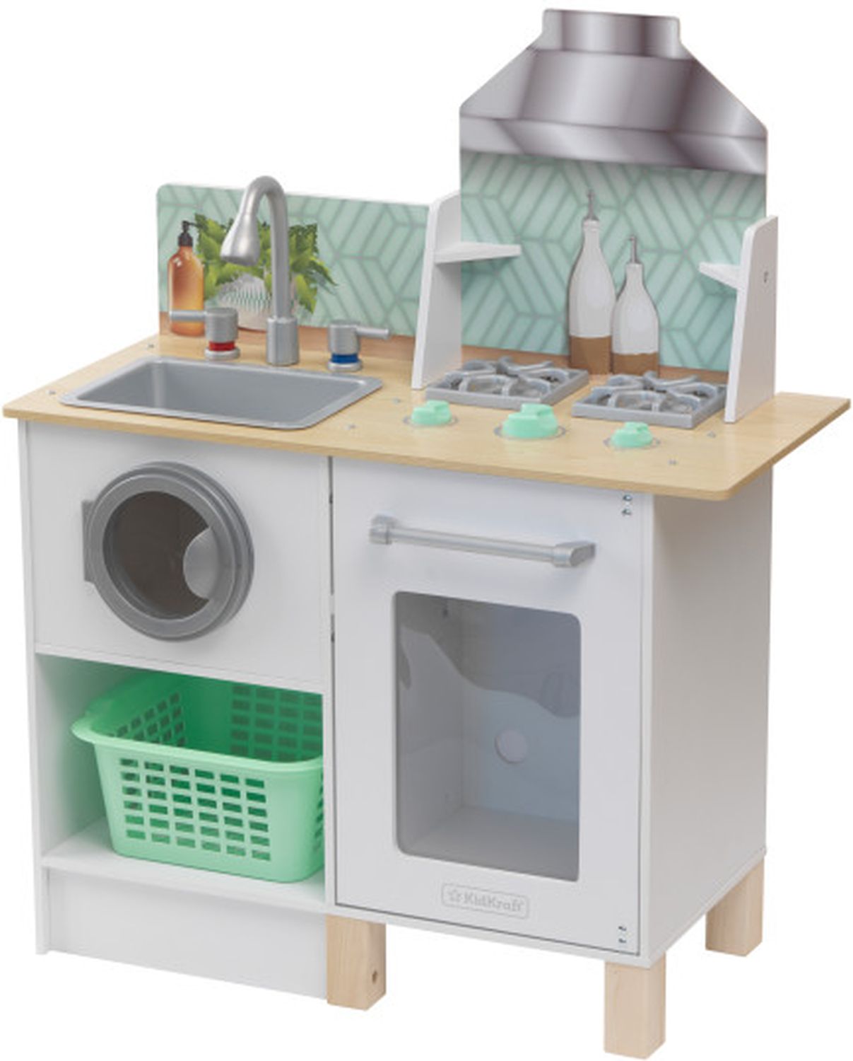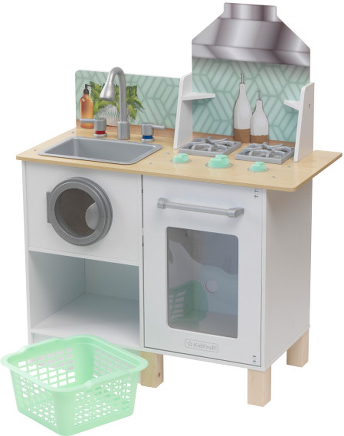 Приятные особенности :Дети будут расти и учиться с двойной системой KidKraft с раковиной, стиральной машиной, духовкой, плитой и вытяжкой. Дети могут готовить и стирать одежду одновременно. Корзина для белья удобно расположена под стиральной/сушильной машиной, чтобы завершить полный цикл стирки. Детям понравится взаимодействие с открывающимися и закрывающимися дверьми, поворотными ручками смесителя и интерактивными циферблатами. Поднятые ножки, фартук с геометрическим рисунком и крючок делают его современным и готовым вдохновить на творчество.