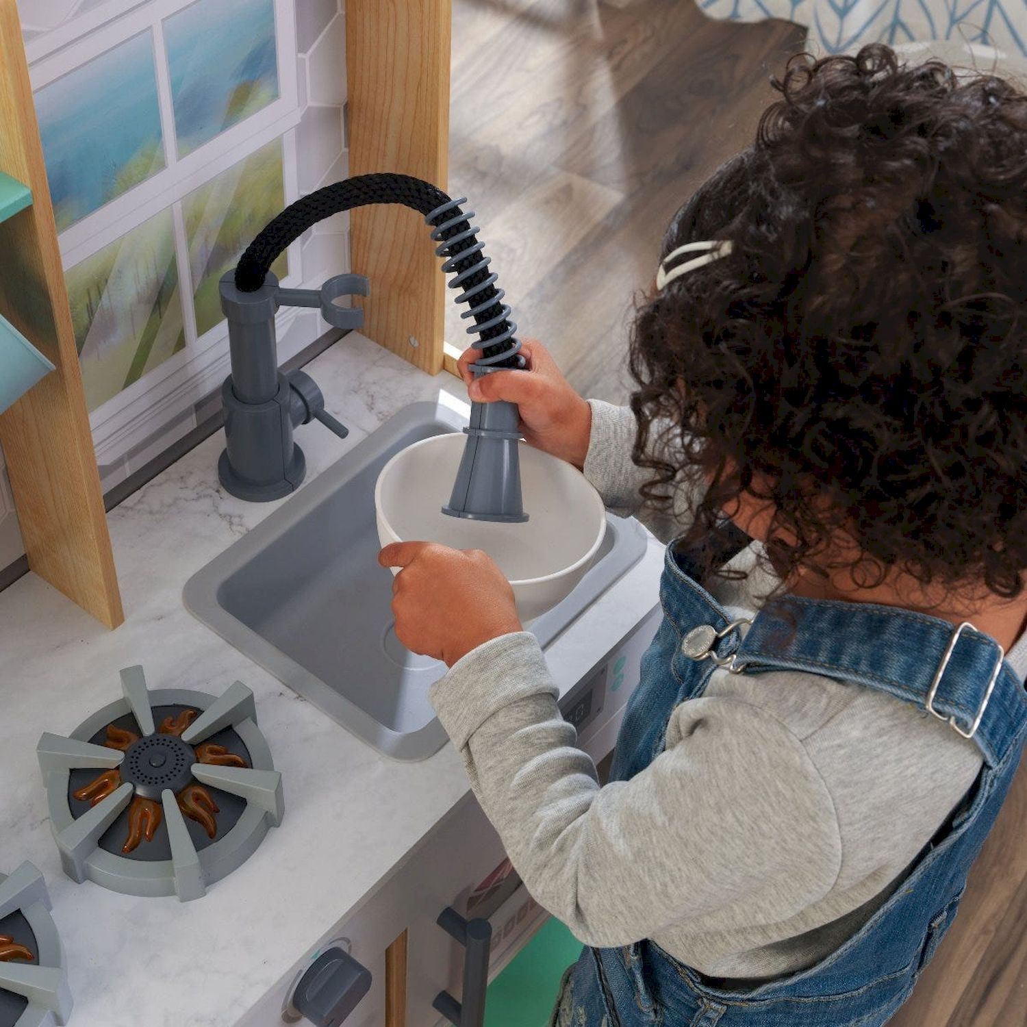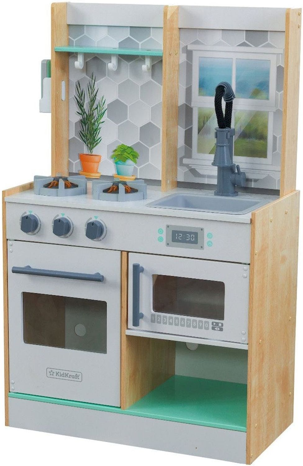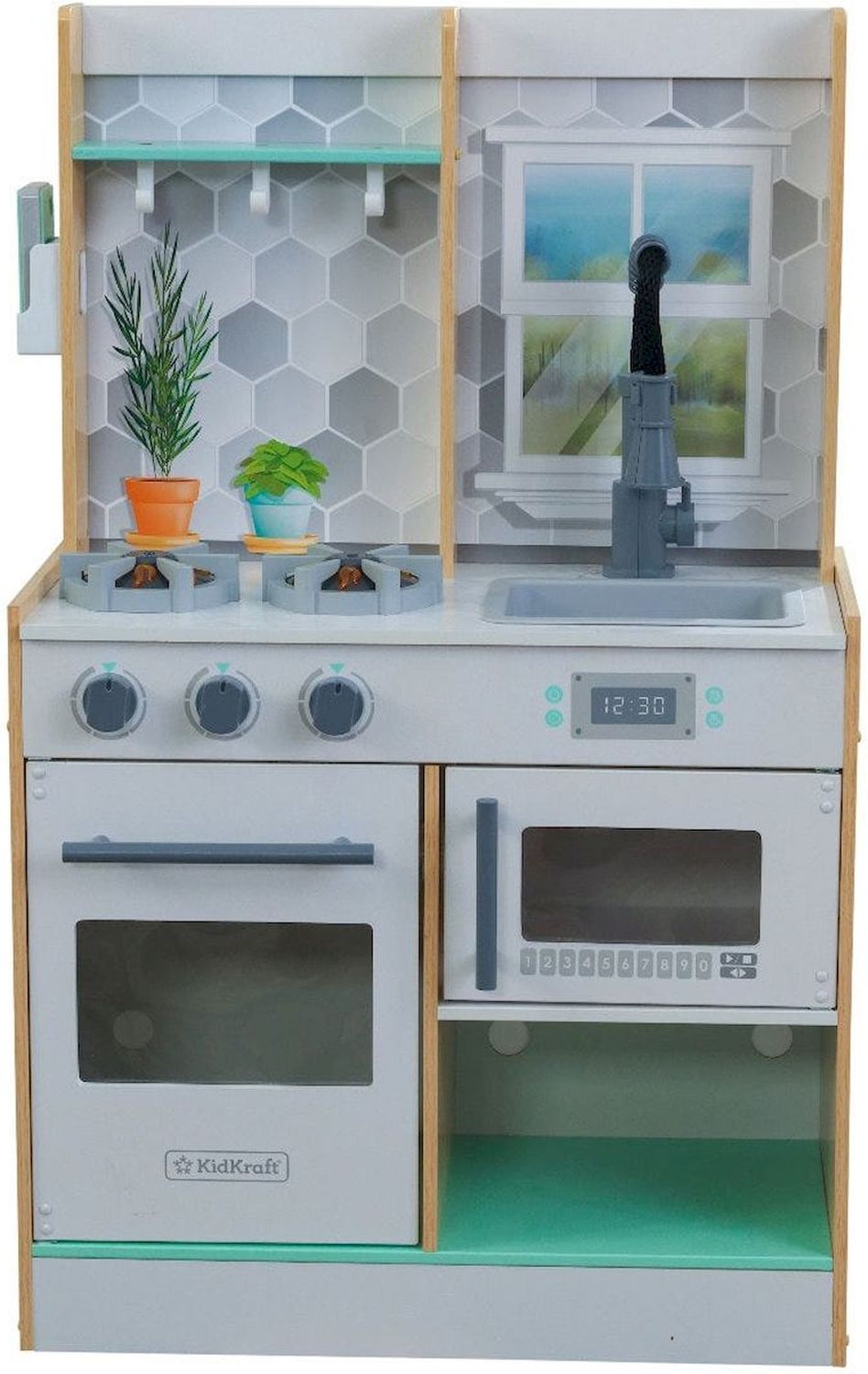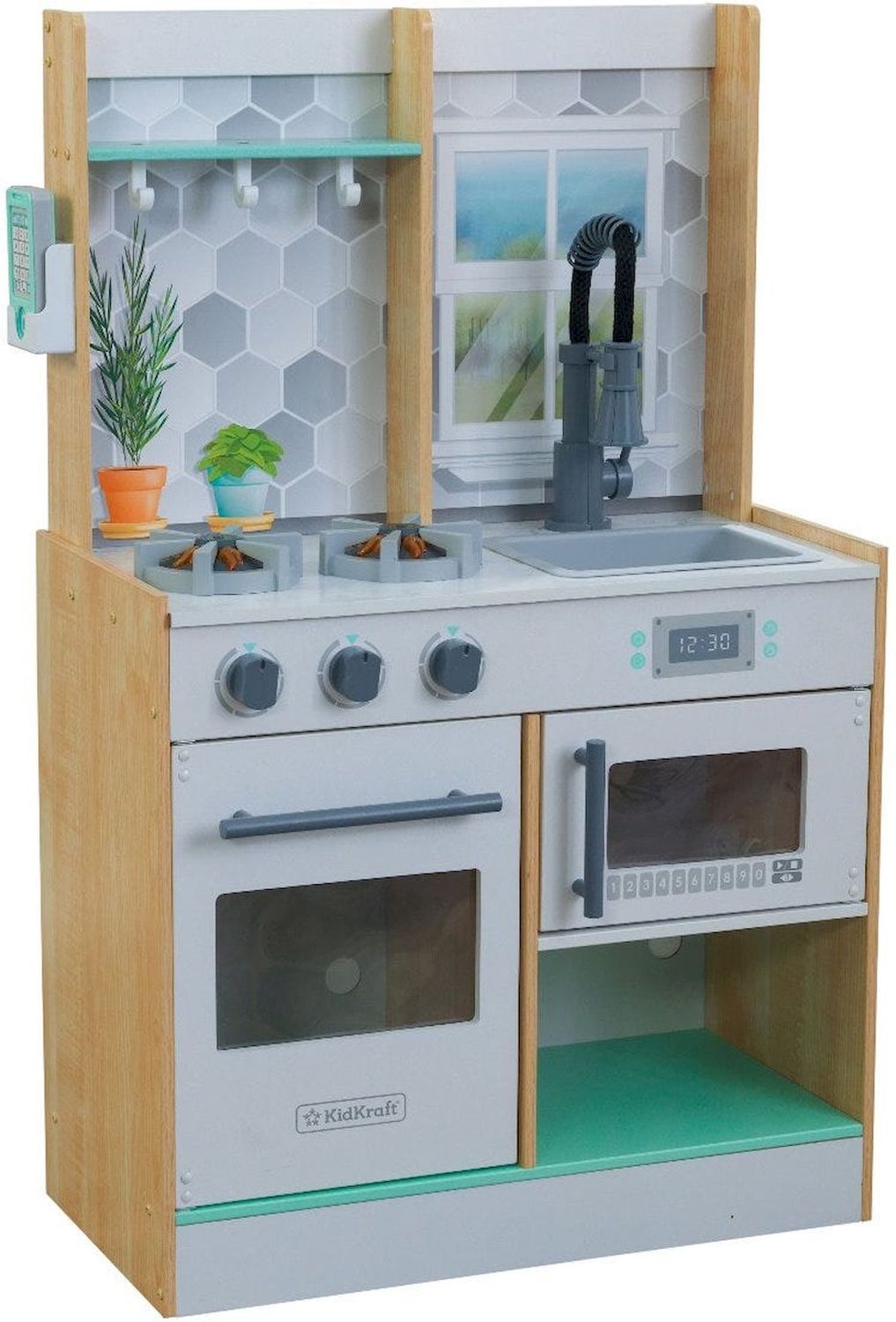 Приятные особенности :Деревянная игровая кухня предлагает множество интерактивных функций. Щелчок и поворот ручки духовки, выдвижной кран и реалистичные конфорки с подсветкой и звуком - это часы удовольствия для начинающих поваров. На стеллажах и крючках достаточно места для хранения игровой еды, столовых приборов и всего, что нужно маленьким поварам для создания творческих блюд для своей семьи. Игровой телефон закреплен на боковой стенке корпуса.