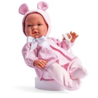 Приятные особенности: Игровой реборн Мария - это точная копия настоящего новорожденного малыша. Рост 43 см, вес 995 гр. Выполнен из высококачественного премиального винила Soft-touch. Тело полностью виниловое, с половыми признаками, с учетом детских физиологических особенностей: детально проработаны все складочки на руках и ногах, маленькие пальчики с ногтевой пластиной, ножки полусогнуты в коленях, цвет винила схож с натуральным цветом кожи. Пупса можно купать! У младенца Марии миловидное личико: блестящие голубые глазки с пушистыми ресничками, кругленькие щечки с румянцем, курносый носик, нежно-розовый приоткрытый ротик. Комплекты ASI выполнены из высококачественных материалов от ведущих испанских кукольных дизайнеров. Мария одета в костюмчик нежно-розового цвета - блуза, ползунки, на голове милейшая шапочка с ушками на атласных завязках. В комплекте пустышка с держателем в виде мишки. Упаковка- фирменная подарочная коробка ASI.