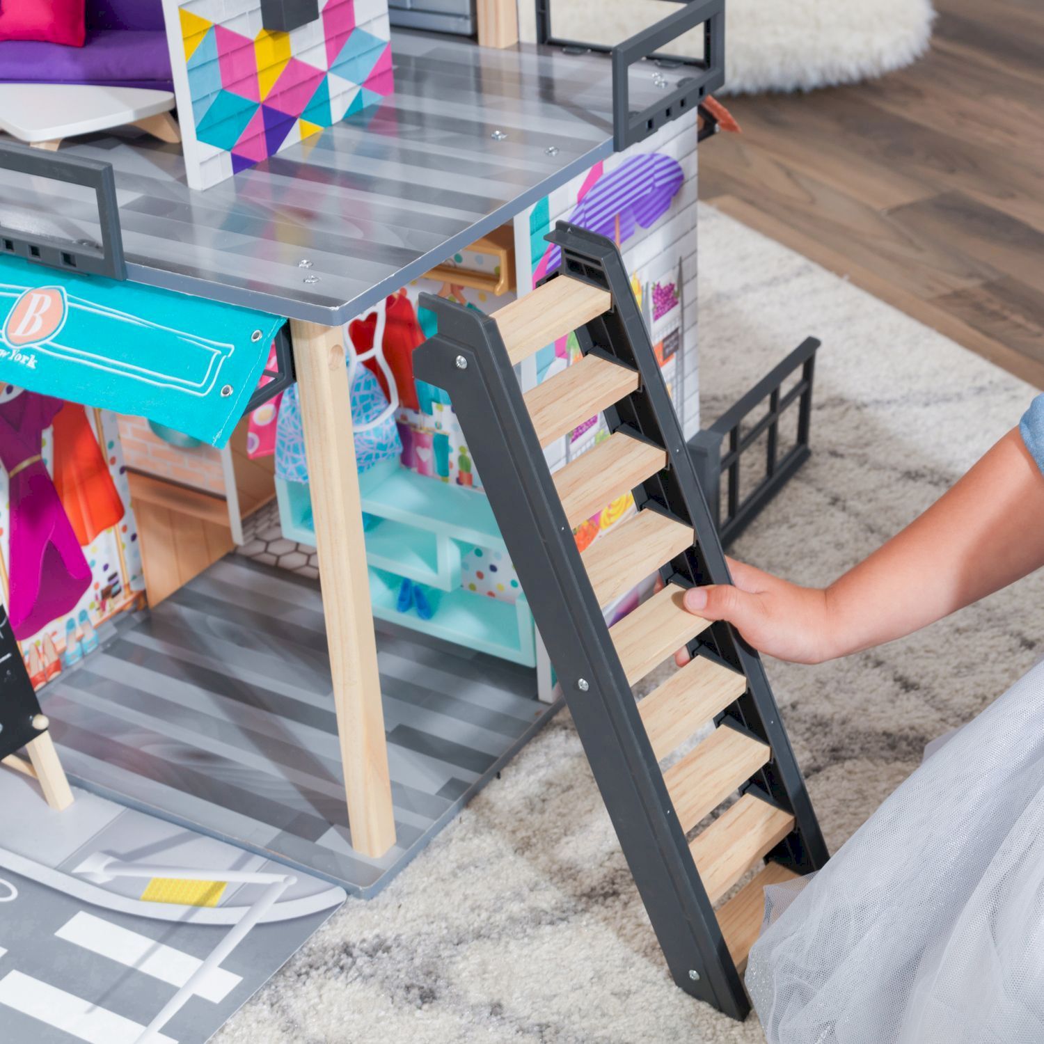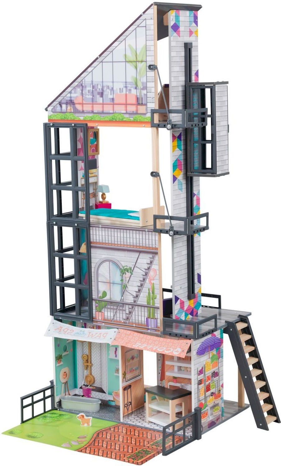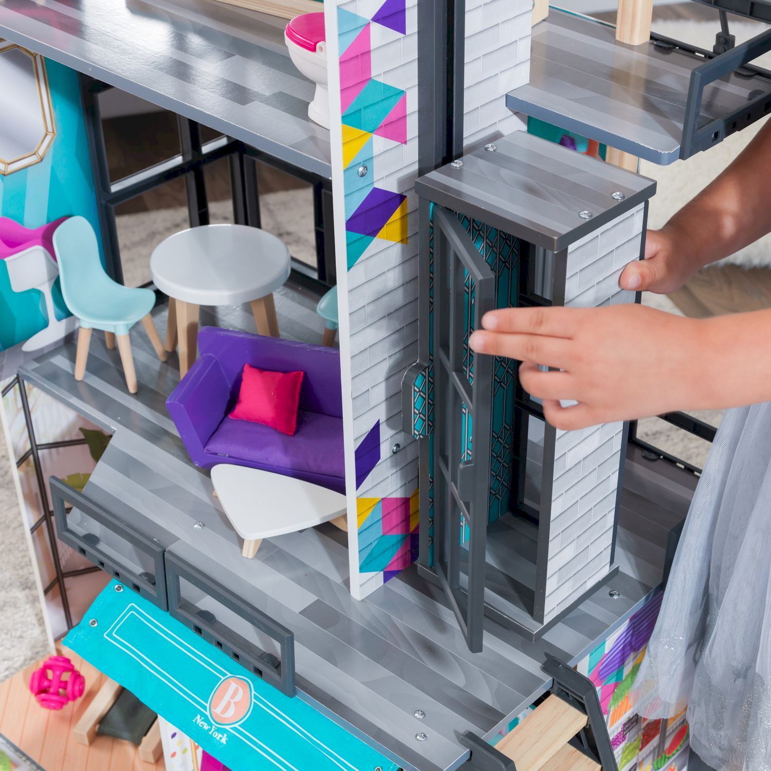 Приятные особенности :Место, где куклы могут жить, работать и играть - этот четырехэтажный кукольный домик Бьянка в стиле небоскреба. Дом в стиле лофт, оформленный с использованием ярких цветов и графических фонов, обладает энергичной атмосферой, которая готовит детей к приключениям. Посетите уличный бутик, кафе, тренажерный зал или салон для домашних животных. Интерактивные функции, такие как светильники, подвижная лестница, лифт и миниатюрная рамка для фотографий, удерживающая изображение, помогают полностью погрузиться в игру.