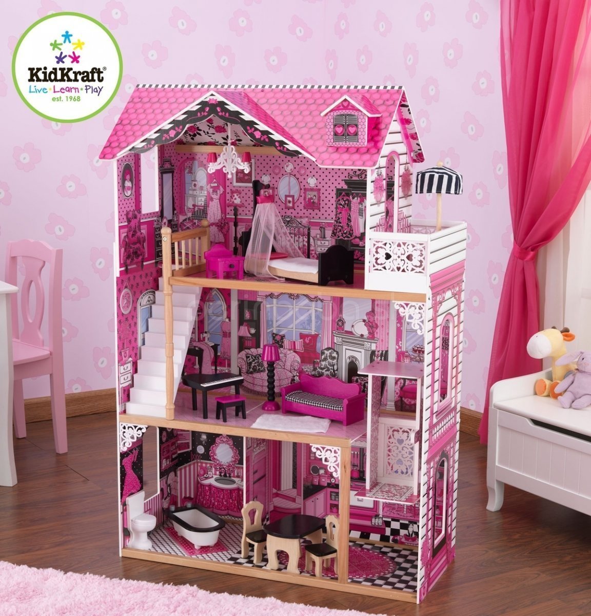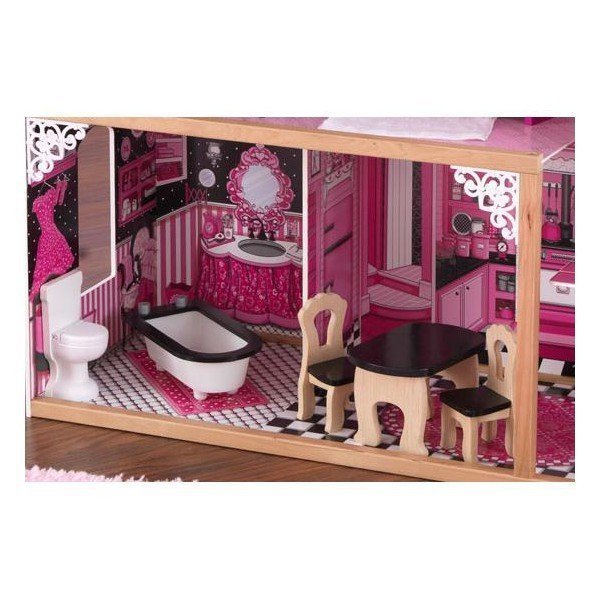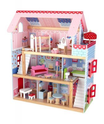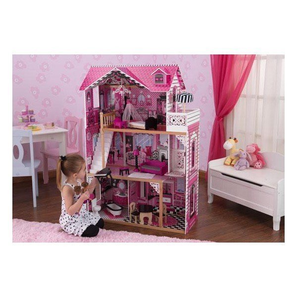Приятные особенности кукольного домика для Барби с мебелью KidKraft Амелия: большой, красивый кукольный домик «Амелия» станет замечательным презентом для вашего ребенка на любой детский праздник. Подарочная упаковка позволит преподнести сюрприз максимально эффектно и ярко. Куколки высотой до 30 см смогут жить в комфортных условиях. Открытая конструкция особняка дает возможность играться сразу несколько девчонкам. Домик имеет 4 просторные комнаты. Добраться на нужный этаж можно будет при помощи лифта и красивой, эффектной белой лестницы. Боковые фасады здания – белые с поперечными полосками. Полы и стены оформлены в каждой комнате индивидуально. Благодаря этому помещение смотрится эффектно и привлекательно. Здание имеет 3 этажа. Ванная и столовая находятся на первом. Если подняться на 2-й, то здесь расположена гостиная. А на 3-ем этаже – спальня и балкон. Крыша оснащена чердачным окном, что позволяет любоваться красивыми пейзажами неба. Набор имеет 14 мебельных предметов. Благодаря этому куклы не будут ни в чем нуждаться, а дети смогут придумать огромное количество сюжетно-ролевых игр. Изготавливается набор из натуральных и экологически чистых материалов. Домашних питомцев, текстиль и куколки придется покупать дополнительно. Проведенное время с игрушкой гарантирует замечательное настроение и огромное количество положительных эмоций, а также развивает творческие способности, внимательность, логическое и пространственное мышление.