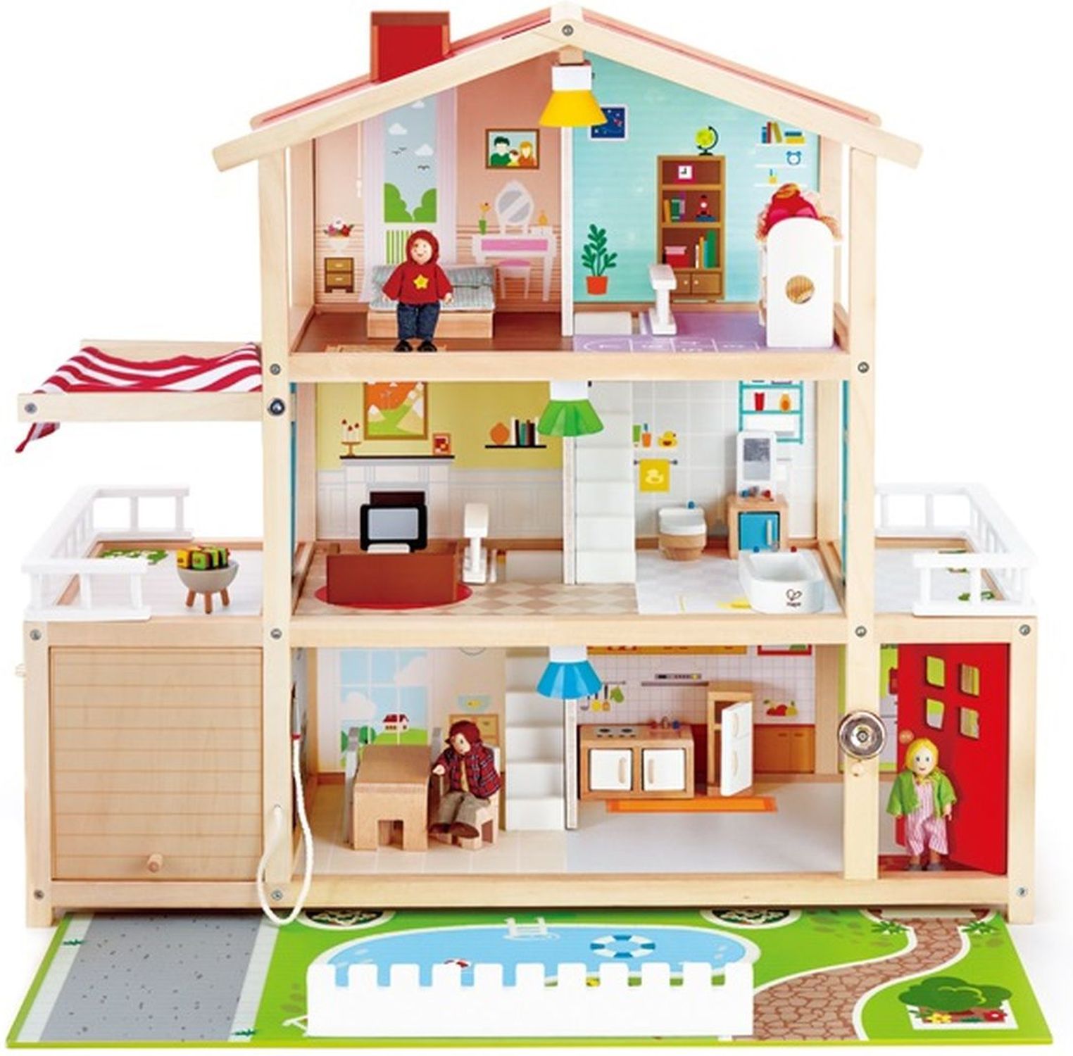 Приятные особенности:Меблированный кукольный домик Hape вдохновляет ребенка на ролевые игры и моделирование домашних ситуациях. Открытый кукольный дом с тремя этажами предлагает широкий выбор способов игры во всех сторон. Кукольный особняк Hape настолько реалистичен, насколько это возможно. Включает в себя спальню, детскую комнату, гостиную, ванную комнату, два балкона (включая тент), столовую, кухню, прихожую, гараж и сад с бассейном.