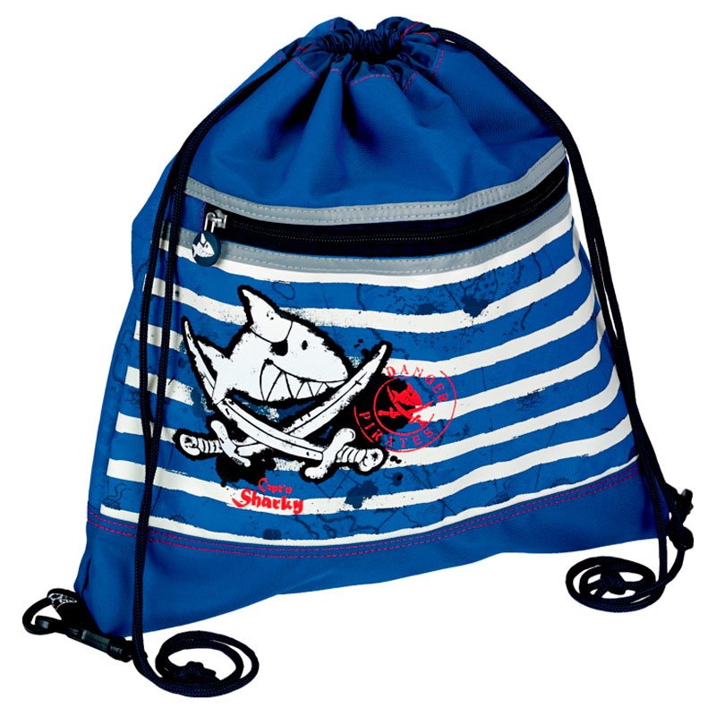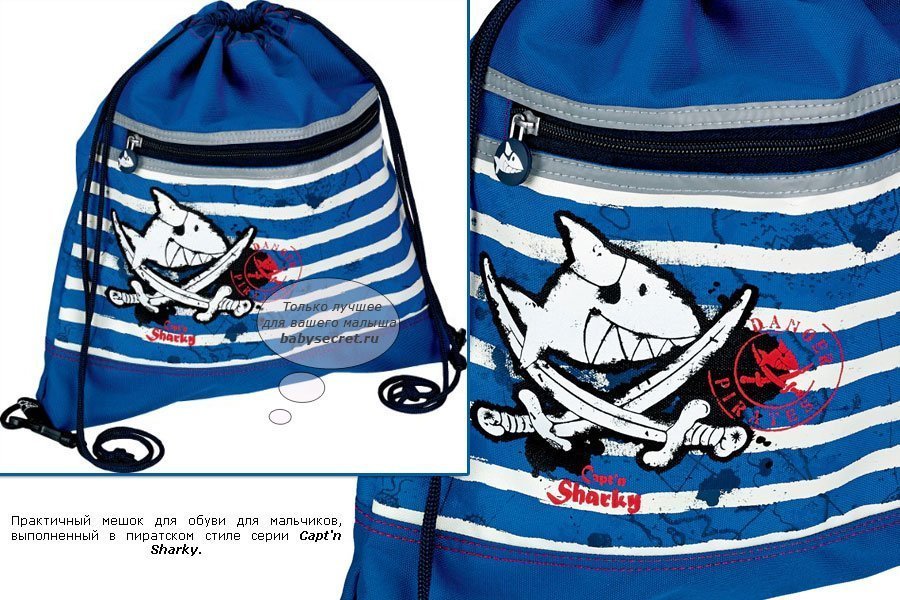 Приятные особенности мешка для обуви Spiegelburg Capt'n Sharky Maritim 30386/10596:практичный мешок для обуви для мальчиков, выполненный в пиратском стиле серии Capt'n Sharky. Сочетание синих и белых полос как на матросках и аппликация пиратского флага с забавной акулой обязательно придется по душе маленькому капитану.