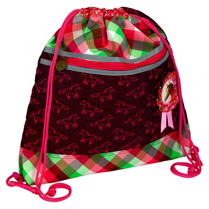 Приятные особенности мешка для обуви Spiegelburg Pferdefreunde 30187:стильный мешочек прекрасно подойдет для хранения сменной обуви школьницы. Мешок затягивается специальными веревочками, с помощью которых его можно носить как рюкзак или просто в руках. Внутри расположены два отделения, кармашек снаружи застегивается на молнию. Мешочек коричневого цвета, украшен вышивкой с изображением лошадки и контрастными розовыми веревочками.