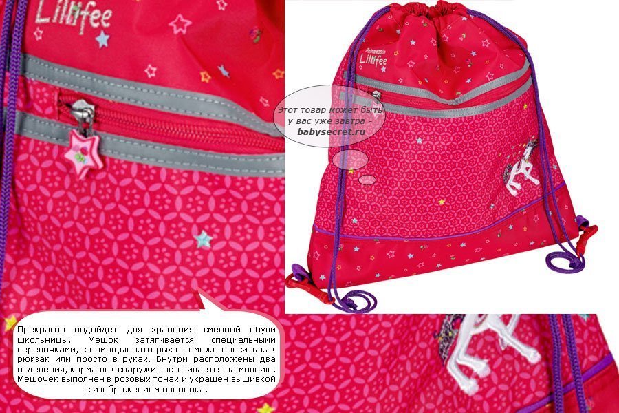 Приятные особенности мешка для обуви Spiegelburg Prinzessin Lillifee :прекрасно подойдет для хранения сменной обуви школьницы. Мешок затягивается специальными веревочками, с помощью которых его можно носить как рюкзак или просто в руках. Внутри расположены два отделения, кармашек снаружи застегивается на молнию. Мешочек выполнен в розовых тонах и украшен вышивкой с изображением олененка.