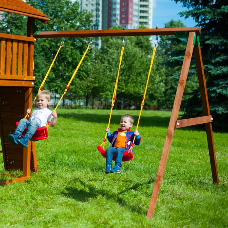Приятные особенности модуля Jungle Gym:Если вам кажется, что на вашем участке вы создали идеальную игровую площадку для детей, присмотритесь – есть ли там качели? Ведь нет такого ребенка, который не обожал бы «взмывать выше ели». Любой из комплексов Jungle Gym может быть оборудован качелями, а именно - дополнительным модуль Jungle Gym Swing. Это классический комплект, который позволяет построить двойные качели, в него включены все необходимые крепления, инструменты для строительства каркаса, так что, никаких проблем не возникнет. Сделайте игровую площадку для детей еще более совершенной! Модуль изготовлен из импрегнированной сосны. Особенность такой обработки дерева заключается в то, что его пропитывают антисептиком с помощью вакуума под высоким давлением: раствор глубоко проникает в древесные волокна, не вымывается водой, и, соответственно, в течение всего срока эксплуатации дерево защищено от гниения и имеет свежий вид. Важно, что такой способ обработки совершенно безопасен и не причинит вреда здоровью человека.