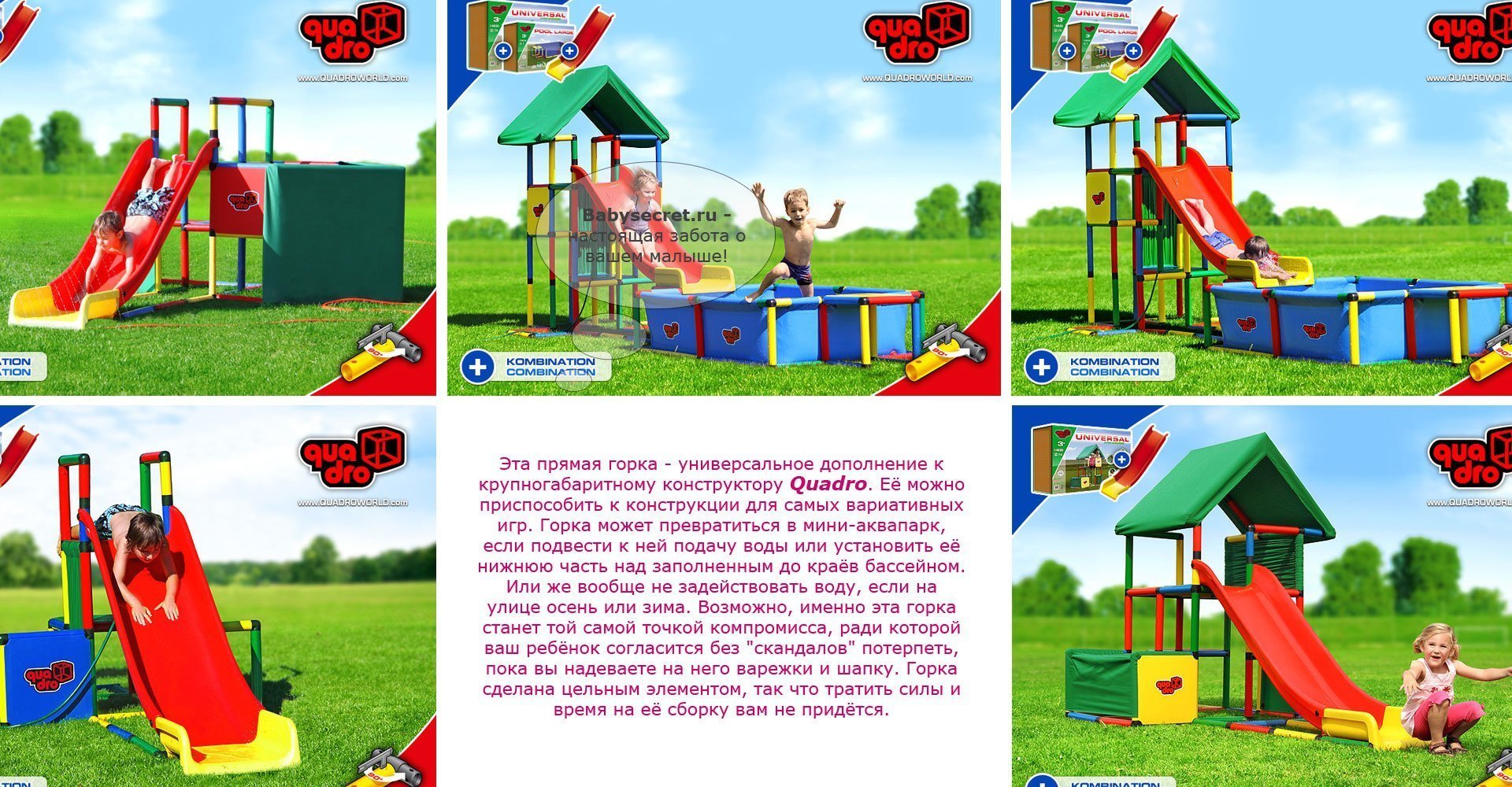 Приятные особенности модульного слайда Quadro 10010:эта прямая горка - универсальное дополнение к крупногабаритному конструктору Quadro. Её можно приспособить к конструкции для самых вариативных игр. Горка может превратиться в мини-аквапарк, если подвести к ней подачу воды или установить её нижнюю часть над заполненным до краёв бассейном. Или же вообще не задействовать воду, если на улице осень или зима. Возможно, именно эта горка станет той самой точкой компромисса, ради которой ваш ребёнок согласится без "скандалов" потерпеть, пока вы надеваете на него варежки и шапку. Горка сделана цельным элементом, так что тратить силы и время на её сборку вам не придётся.
