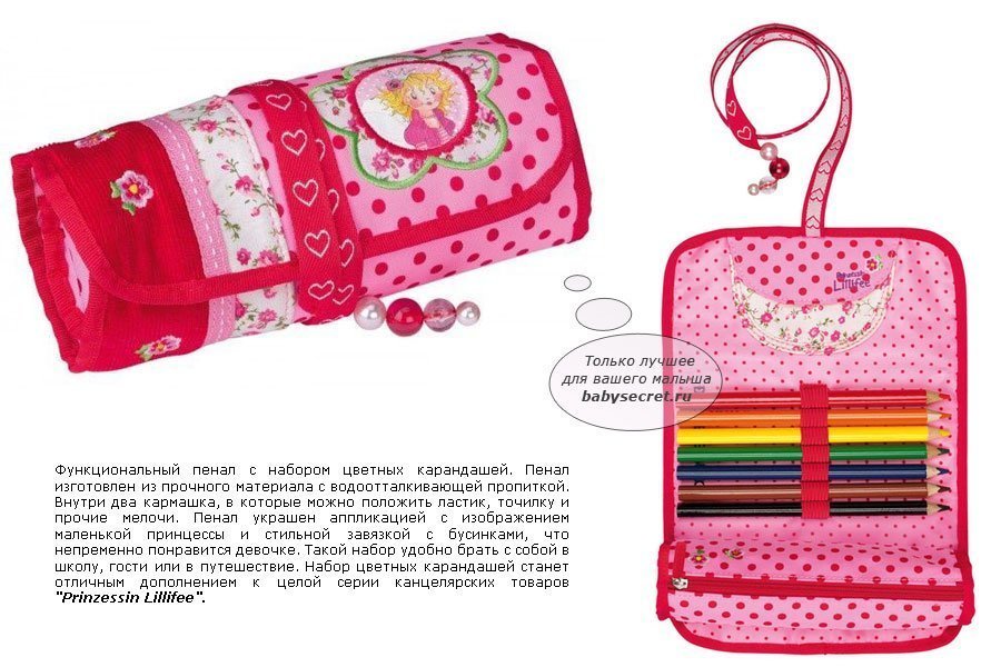 Приятные особенности набора цветных карандашей Spiegelburg Prinzessin Lillifee 30409:функциональный пенал с набором цветных карандашей. Пенал изготовлен из прочного материала с водоотталкивающей пропиткой. Внутри два кармашка, в которые можно положить ластик, точилку и прочие мелочи. Пенал украшен аппликацией с изображением маленькой принцессы и стильной завязкой с бусинками, что непременно понравится девочке. Такой набор удобно брать с собой в школу, гости или в путешествие. Набор цветных карандашей станет отличным дополнением к целой серии канцелярских товаров "Prinzessin Lillifee".