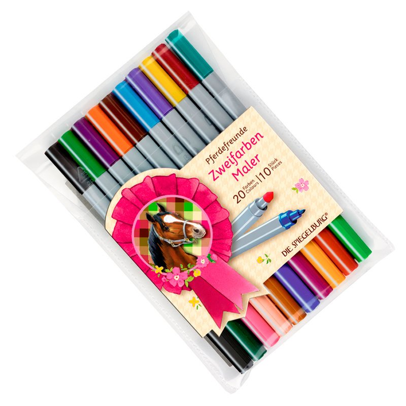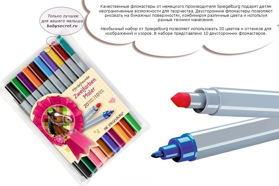 Приятные особенности набора двусторонних фломастеров Spiegelburg Pferdefreunde 11163:качественные фломастеры от немецкого производителя Spiegelburg подарят детям неограниченные возможности для творчества. Двусторонние фломастеры позволяют рисовать на бумажных поверхностях, комбинируя различные цвета и используя разные техники нанесения. Необычный набор от Spiegelburg позволяет использовать 20 цветов и оттенков для изображений и узоров. В наборе представлено 10 двусторонних фломастеров.