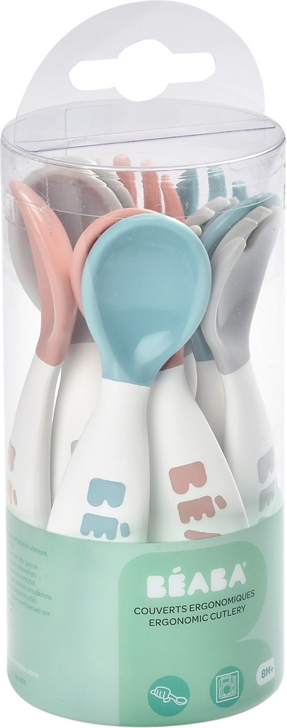 Приятные особенности :Набор Beaba эргономичных ложечки и вилки, которые созданы специально для самых маленьких ручек.Малышам удобно кушать самостоятельно из столовых приборов Beaba.Можно мыть в посудомоечной машине.Не содержит Бисфенол А.