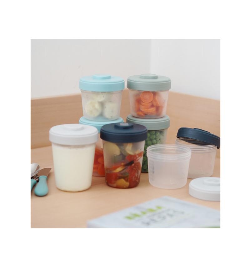 Прочные и герметичные, вы можете положить их в детскую сумку без риска протекания. Изготовленные из высококачественного полипропилена, их можно хранить в холодильнике и морозильной камере. В них без труда вы сможете разморозить и разогреть (без крышки) в микроволновой печи, чаше Babycook и водяной бане (в Bib-Expresso).