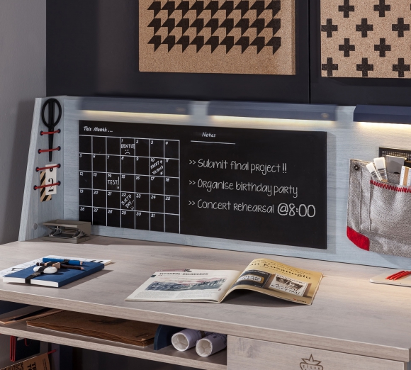 Приятные особенности:Данная надстройка к письменному столу особенно актуальна среди детей школьного возраста и подростков. Она не просто имеет современный дизайн – светлое дерево, нашитые кармашки для хранения аксессуаров, присутствие красной шнуровки. Достоинством стоит считать продуманную практичность – наличие доски для записей (календарь, чистая сторона). Можно записывать свои мысли мелками, после чего стирать и использовать пространство повторно. Присутствие порта для USB и светодиодного освещения делают Cilek Trio еще практичнее.