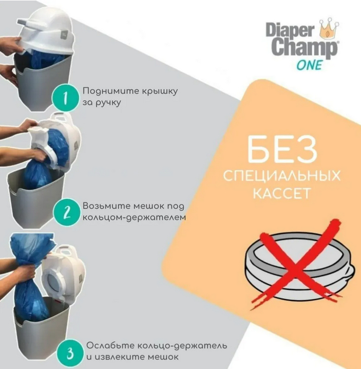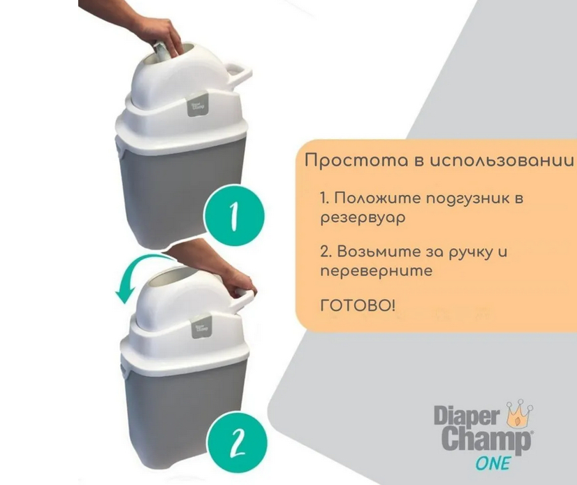 Приятные особенности: Накопитель для подгузников Diaper Champ One -удобная и экономичная модель, которая совсем не пропускает запахи. Этой новинке не нужны дорогие кассеты, с Champ Вы можете использовать любой пакет! Новинка проста в обращении - просто поместите подгузник, поверните ручку и он уже в накопителе.