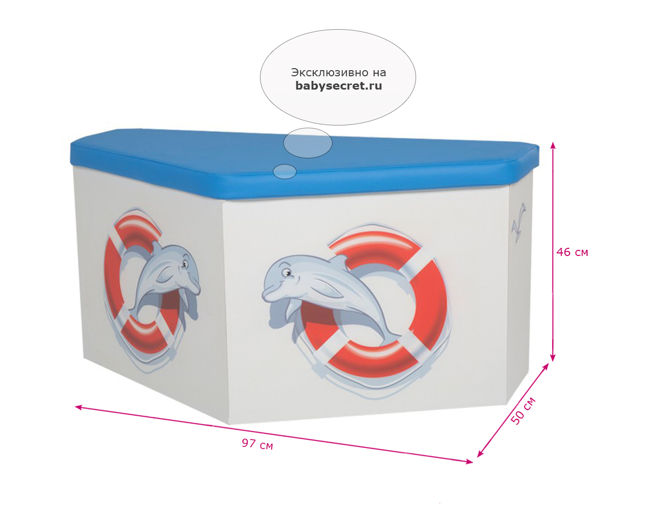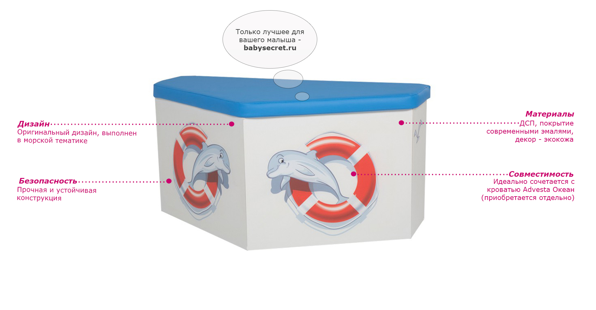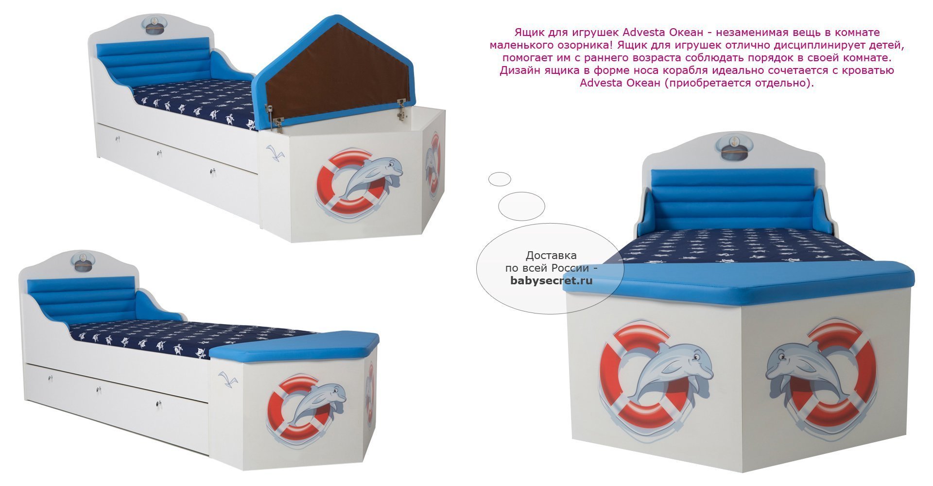 Приятные особенностиящика для игрушек Океан:ящик для игрушек Океан - незаменимая вещь в комнате маленького озорника! Ящик для игрушек отлично дисциплинирует детей, помогает им с раннего возраста соблюдать порядок в своей комнате. Дизайн ящика в форме носа корабля идеально сочетается с кроватью Океан (приобретается отдельно).