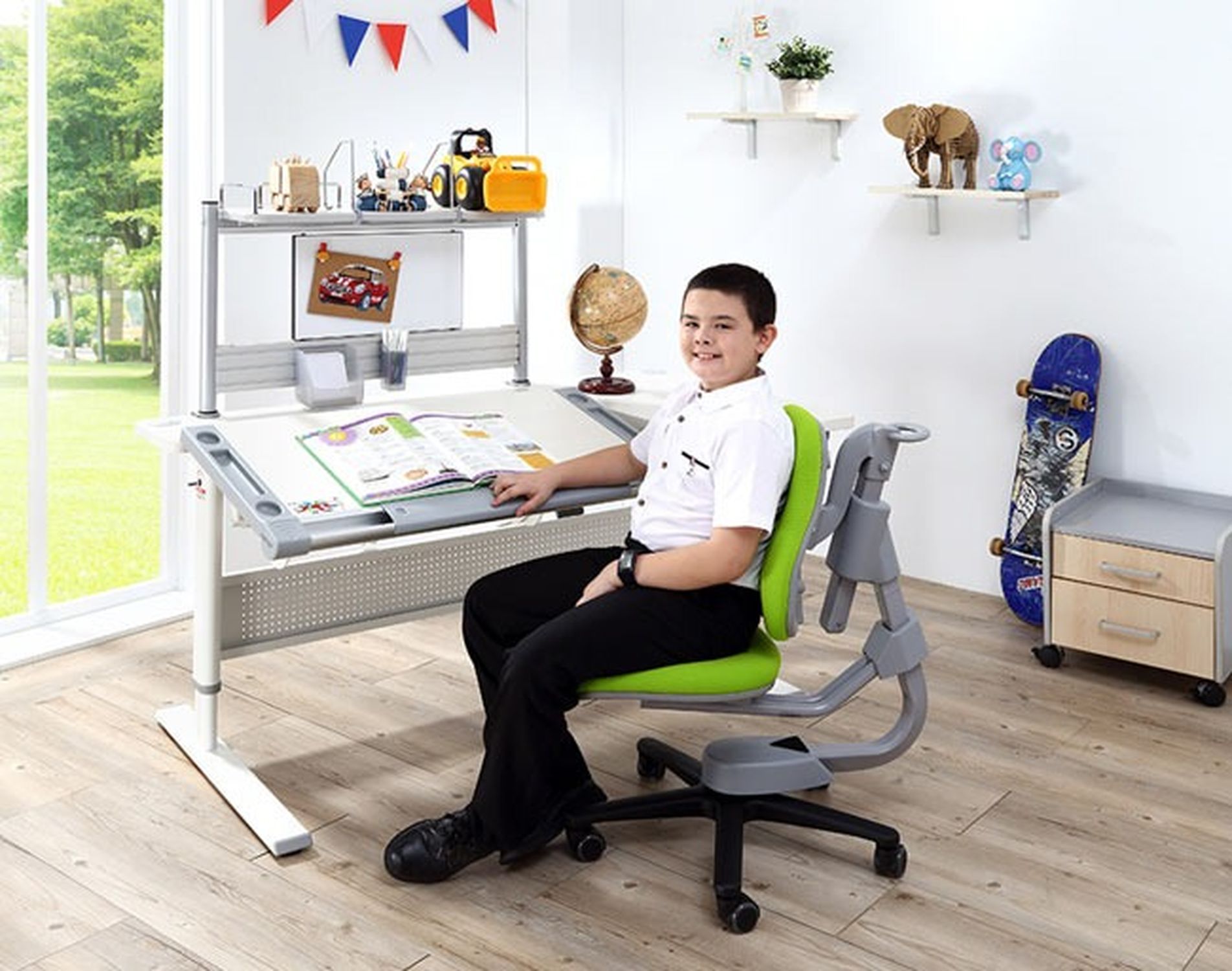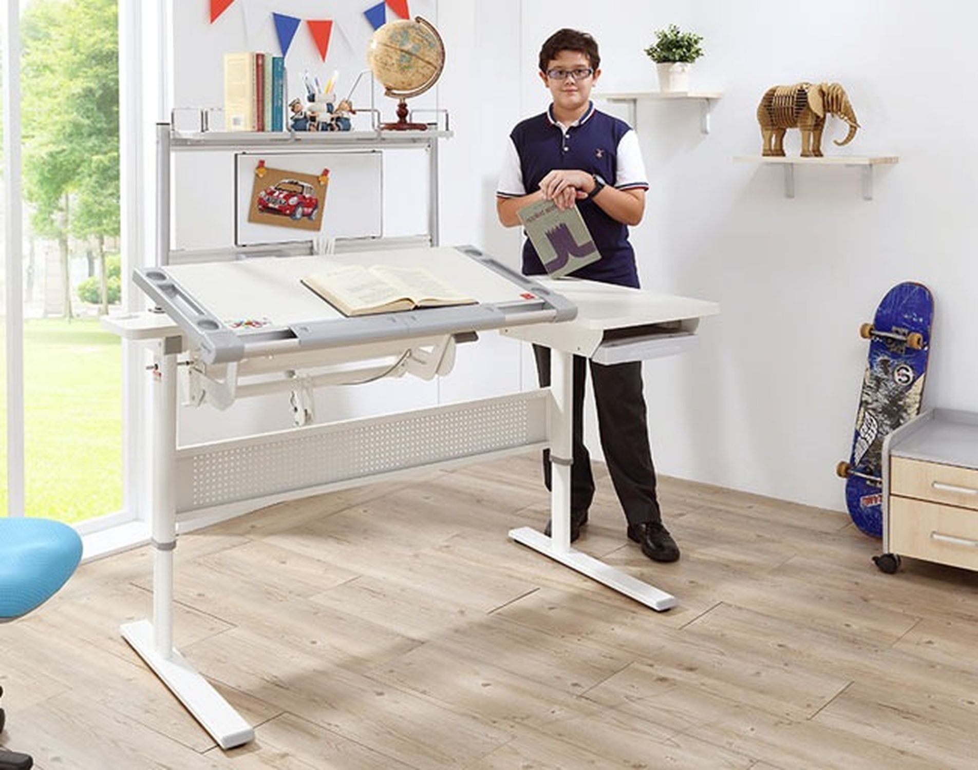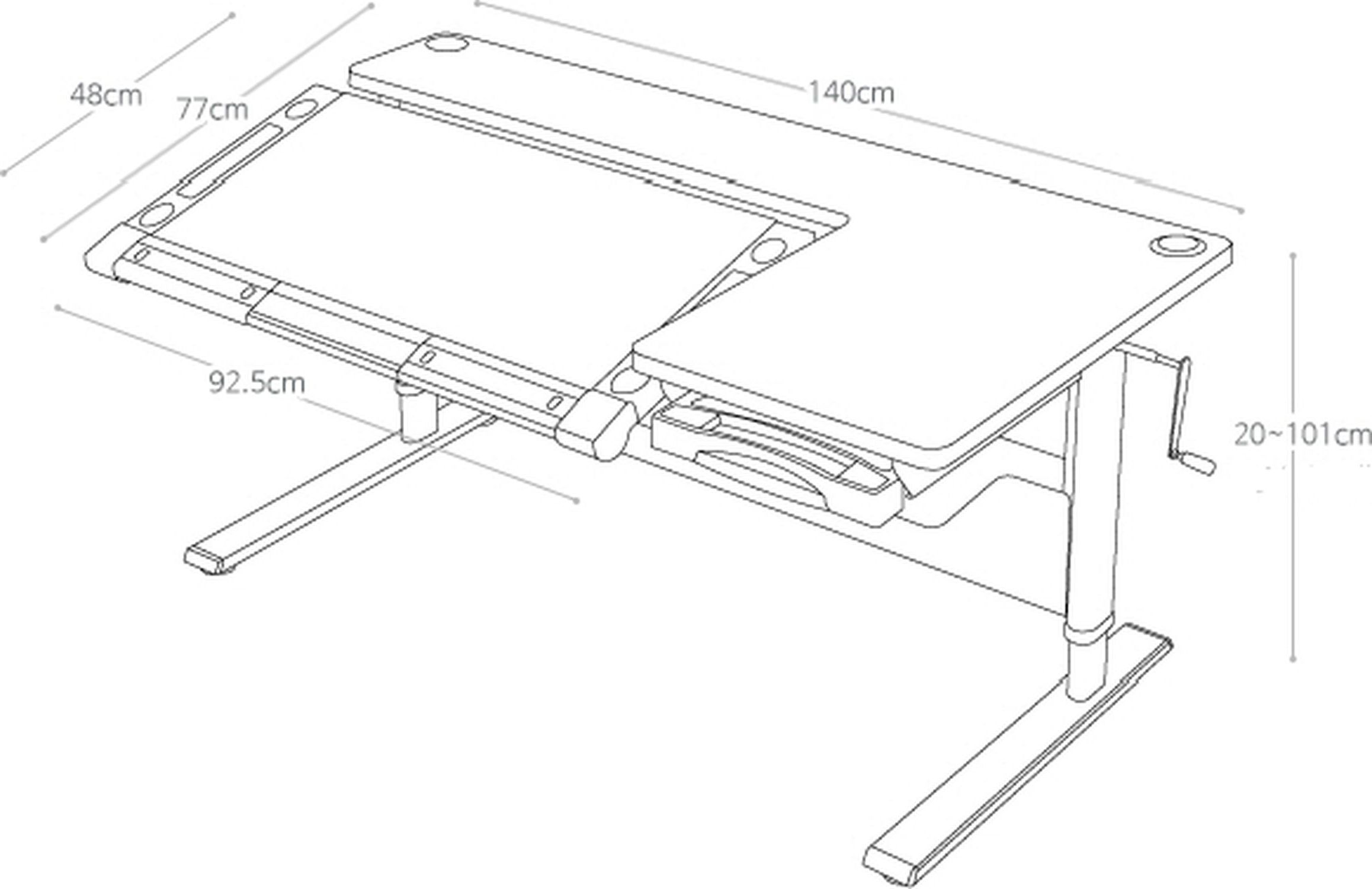Приятные особенности:Расширенный диапазон настроек стола от положения сидя на полу до положения стоя для человека ростом свыше 190 см.Высота всего стола регулируется благодаря подъемному механизму, который приводится в движение ручкой сбоку под столешницей. А высота наклоняемой части столешницы регулируется отдельно немецким газ-лифтом STABILUS. Все это позволяет использовать стол как двух-трех летним детям, сидя на полу, так и высокому человеку - стоя.Покрытие столешницы -меламин эффективно защищающий от проникновения влаги и внешних воздействий.Регулируемые ножки - способны придать парте горизонтальное положение даже на не ровном полу.