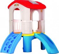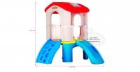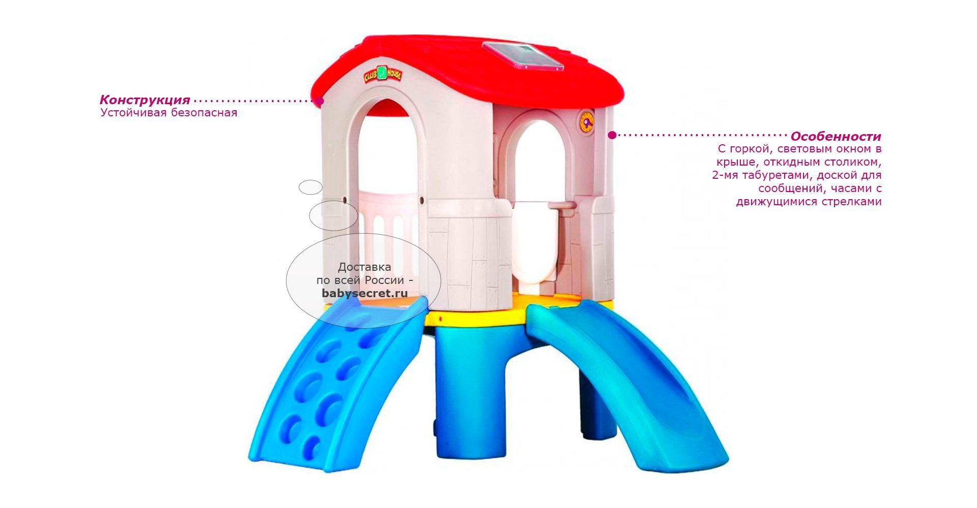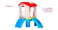 Приятные особенности павильона с горкой Lerado LA-519:детский комплекс имеет павильон, находящийся на возвышении с горкой, световым окном в крыше, откидным столиком, 2-мя табуретами, доской для сообщений, часами с движущимися стрелками. Под павильоном есть место для игр.