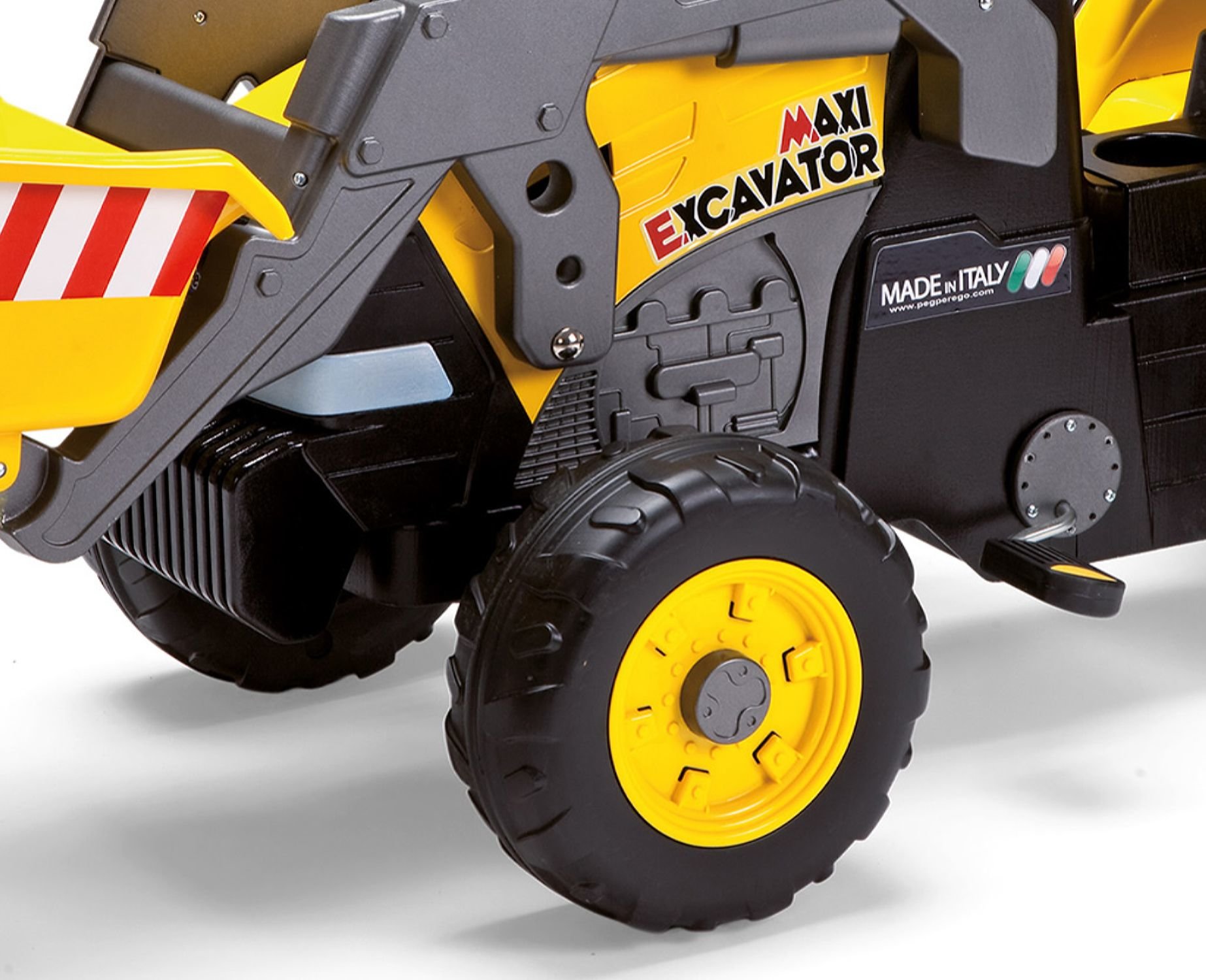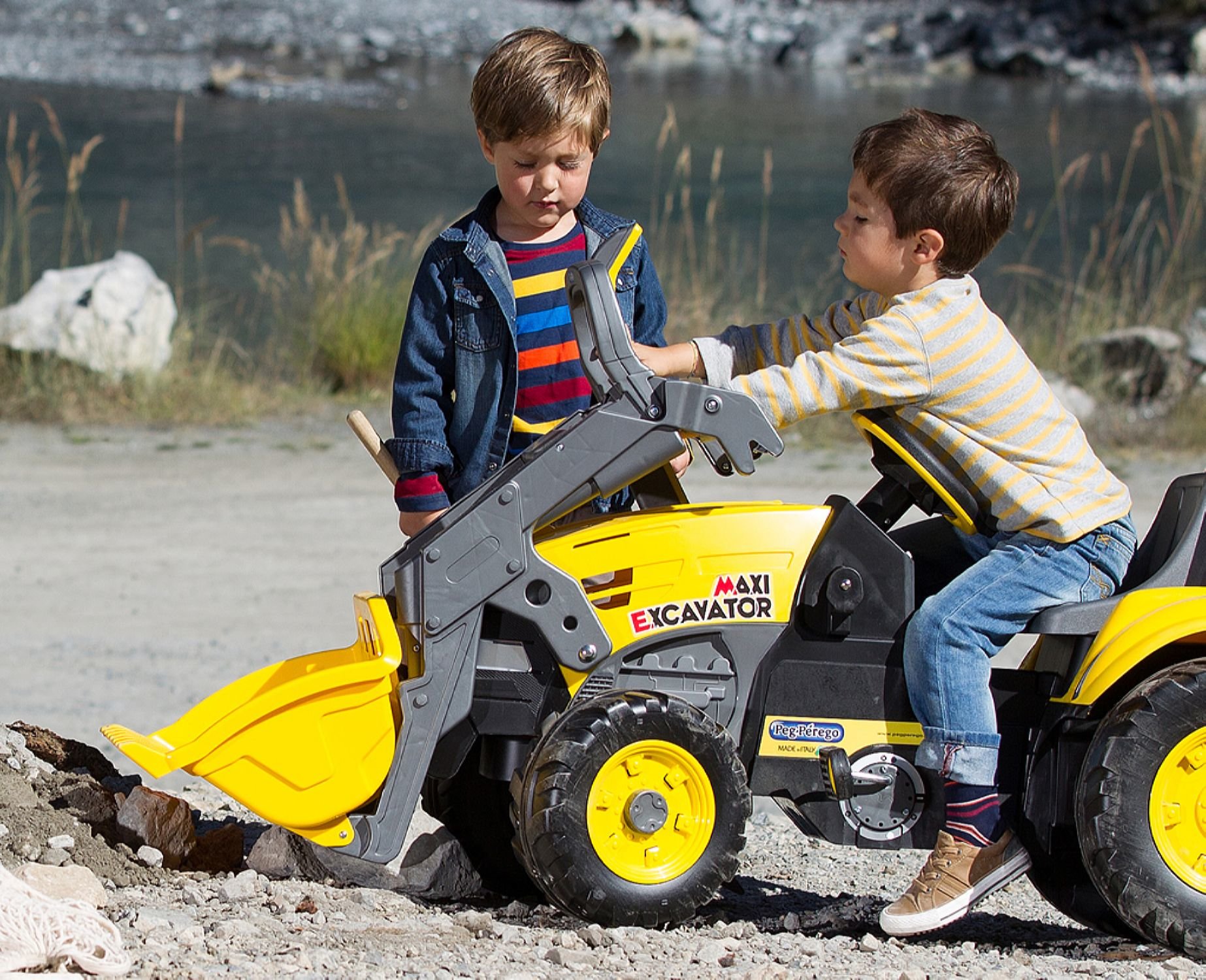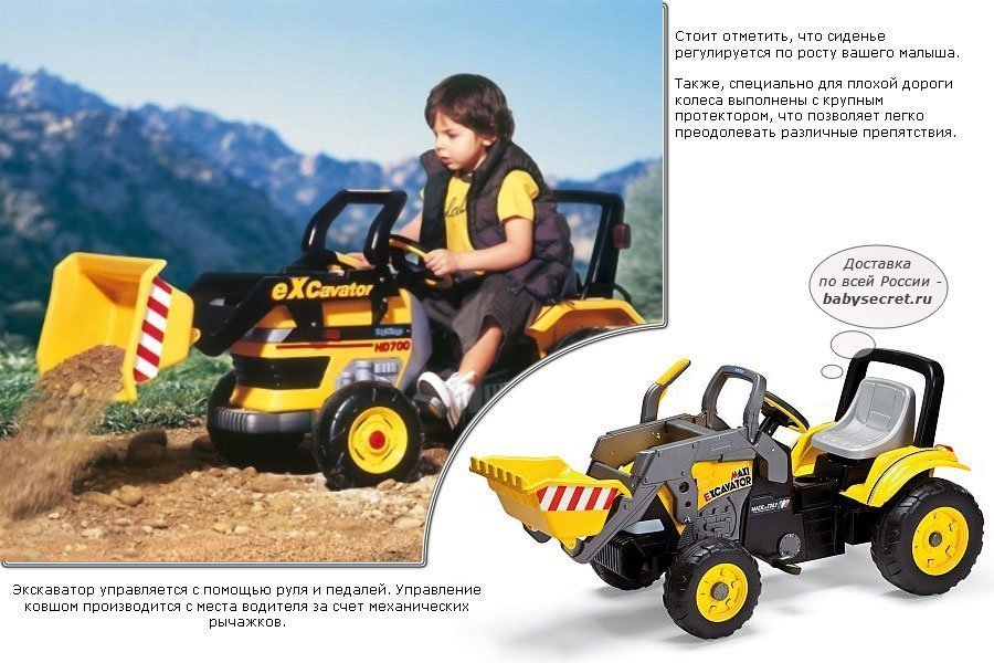 Приятные особенности педальной машины Peg-Perego Excavator:управляется с помощью руля и педалей. Управление ковшом производится с места водителя за счет механических рычажков. Стоит отметить, что сиденье регулируется по росту вашего малыша. Также, специально для плохой дороги колеса выполнены с крупным протектором, что позволяет легко преодолевать различные препятствия.