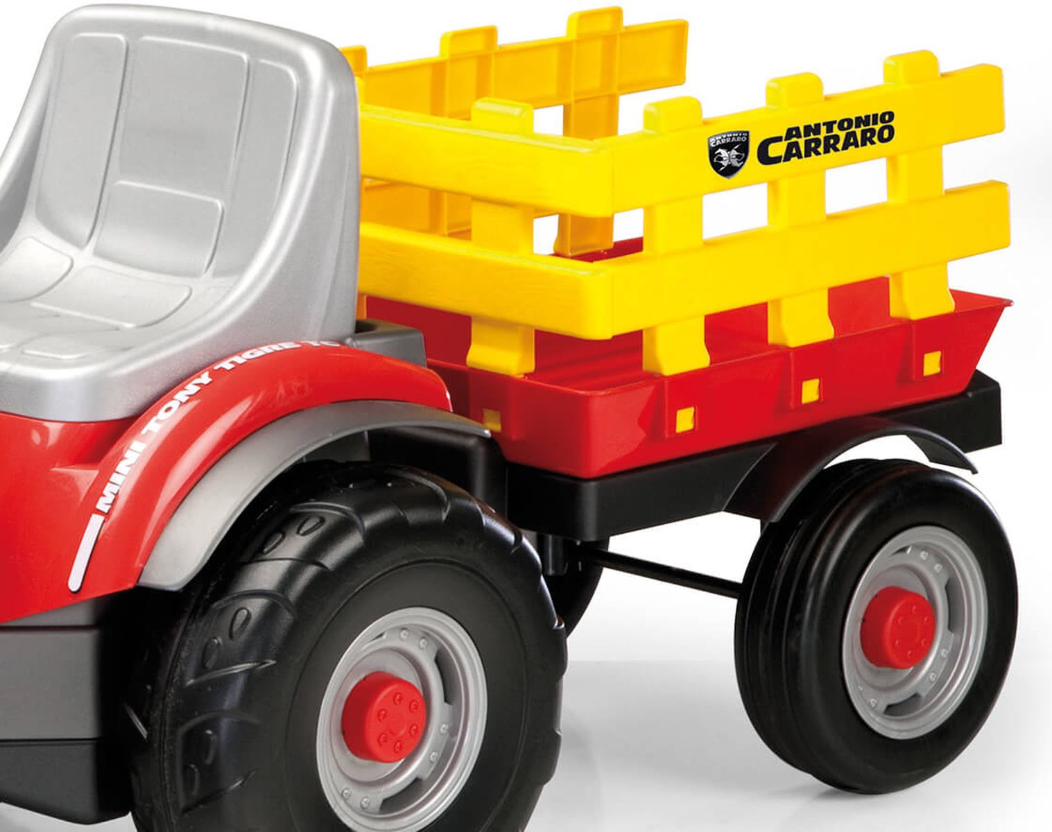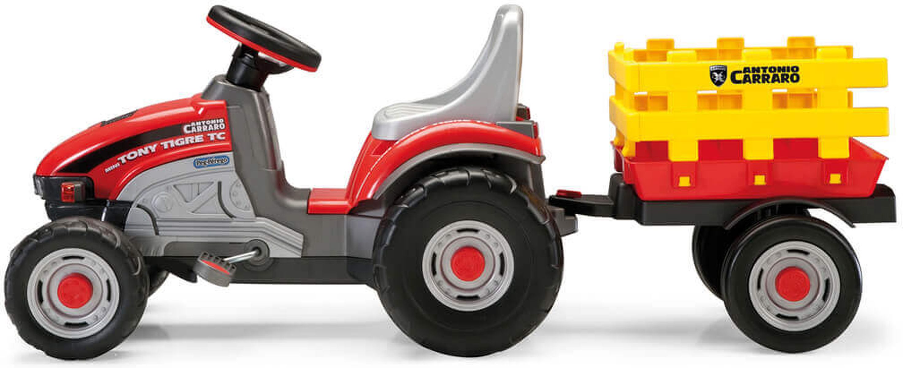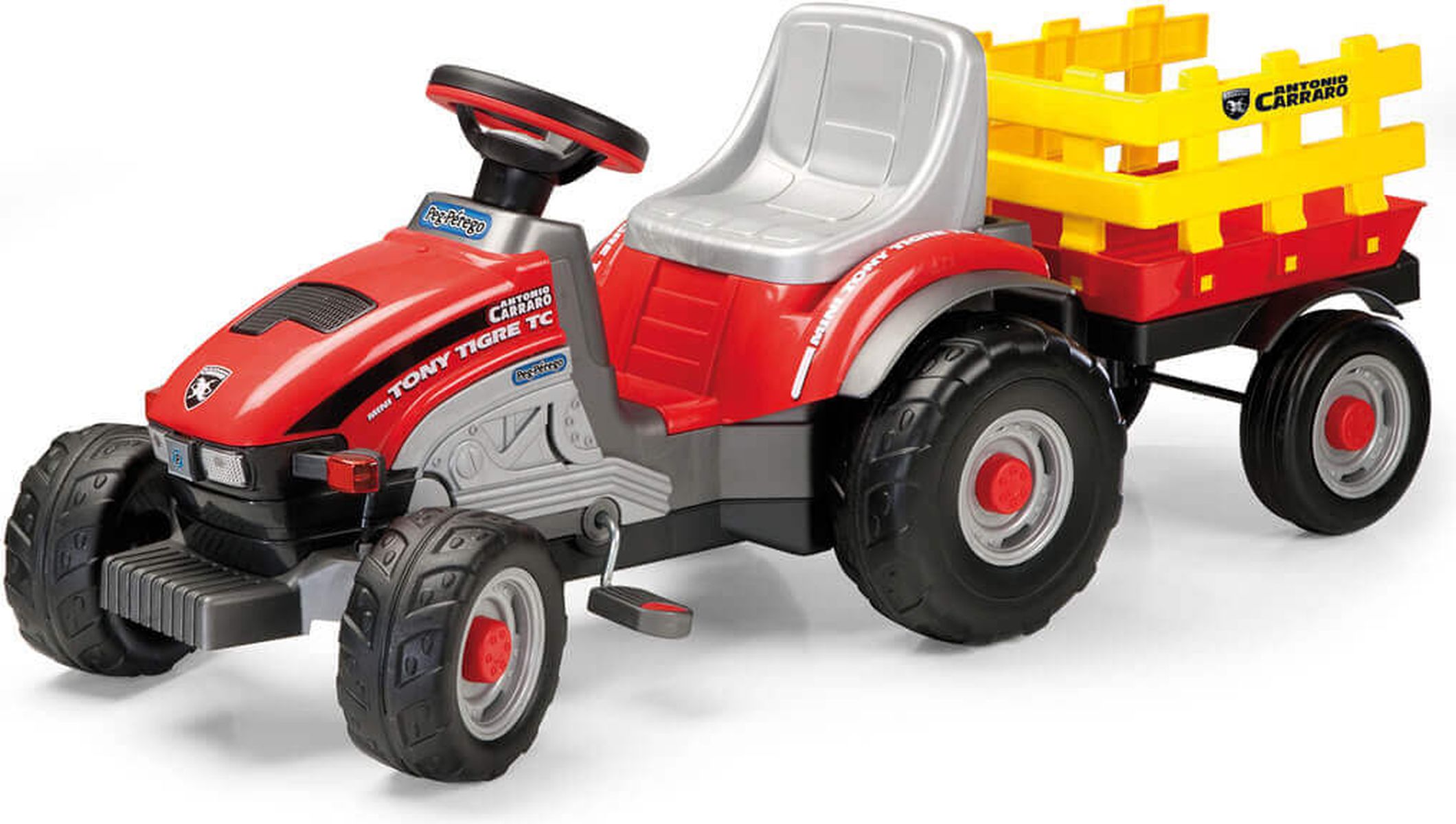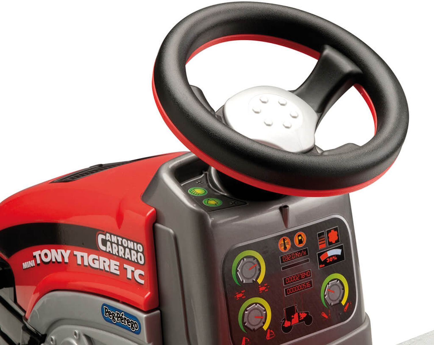Приятные особенности:Шины педального трактора обладают рифлёным протектором, обеспечивающего отличное сцепление с дорогой. В движение трактор приводится механическими усилиями водителя, который нажимая на педали, заставляет двигаться колёса Peg Perego Mini Tony Tigre. Сиденье регулируется в двух положениях, в зависимости от роста и возраста ребёнка. Внешний вид схож с настоящим трактором: большие брызговики, объёмные фары со светоотражателями, индикаторы заряда и капот вытянутой формы. Приборная панель представляет собой копию торпедо настоящего трактора.