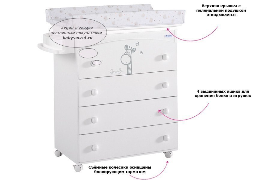 Приятные особенности пеленального комода с ванночкой Micuna Sabana B-970:красивый и практичный пеленальный комод заменяет целый набор разнообразной мебели. Всё в нём создано для Вашего комфорта: мягкий пеленальный матрасик, под рукой – полочка для важных мелочей, вместительные ящики легко двигаются на металлических направляющих. Если откинуть крышку, под ней откроется анатомическая ванночка для купания. Самоцентрирующиеся колёсики позволяют легко передвинуть комод, не поцарапав паркет.