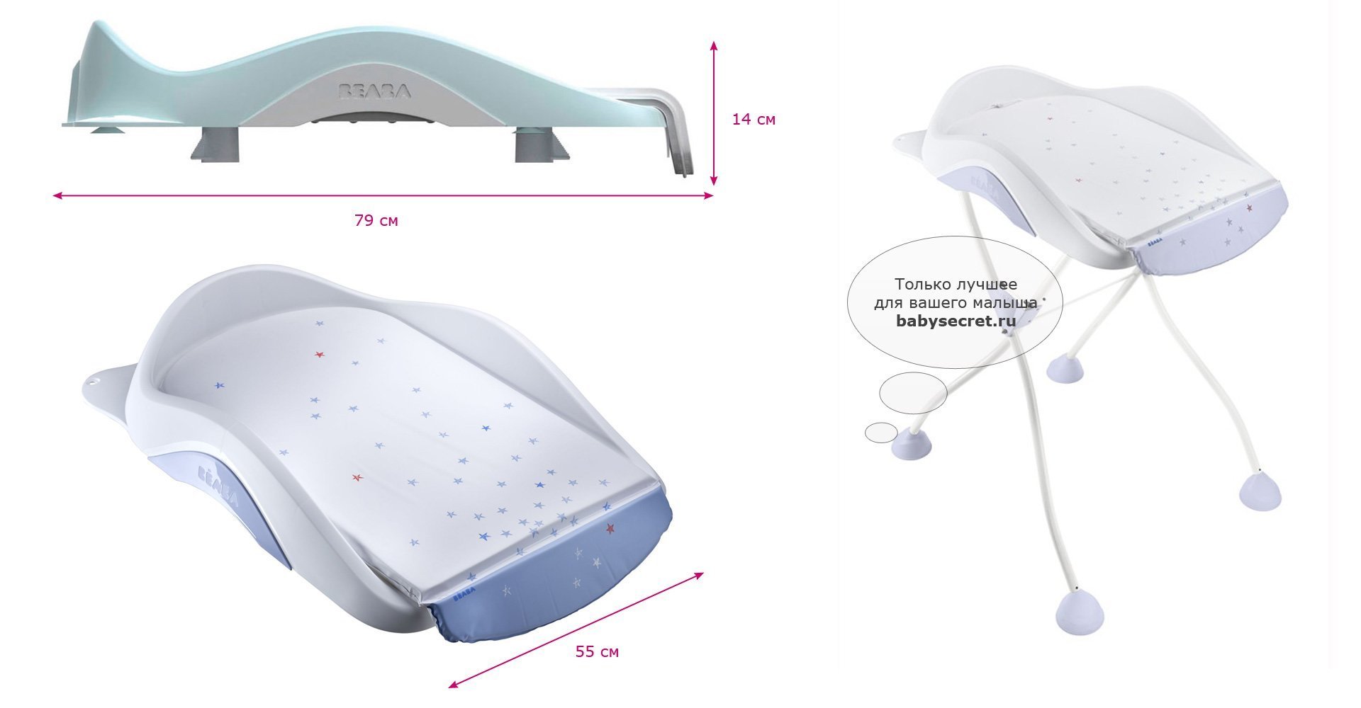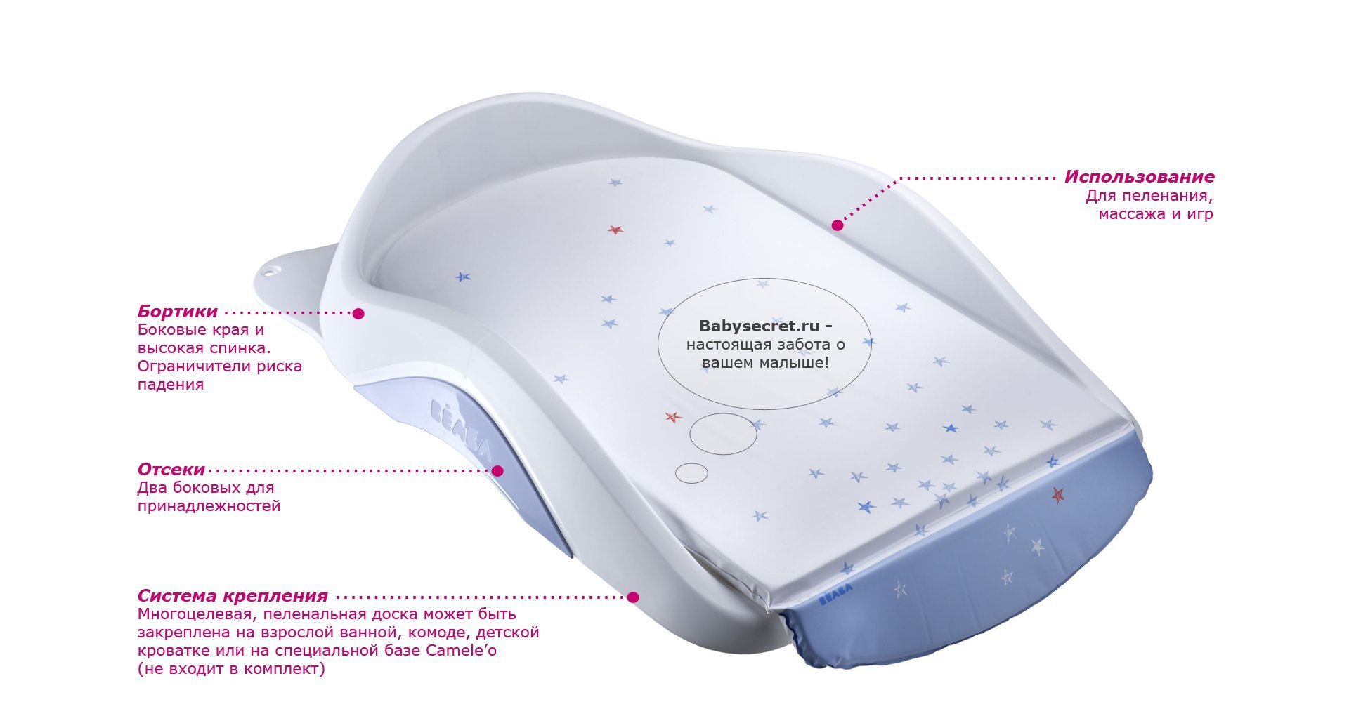 может быть закреплен, благодаря его многоцелевой системе крепления на взрослой ванной, комоде, детской кроватке или на специальной подставке Camele’o
