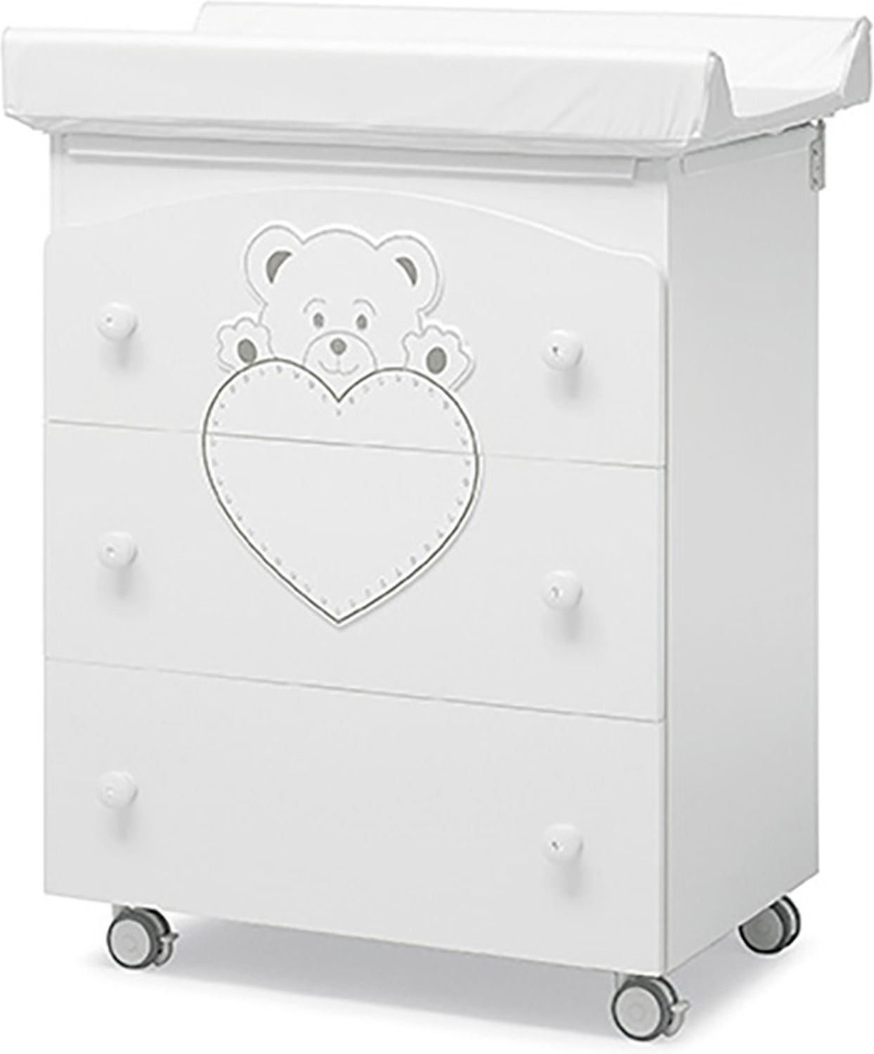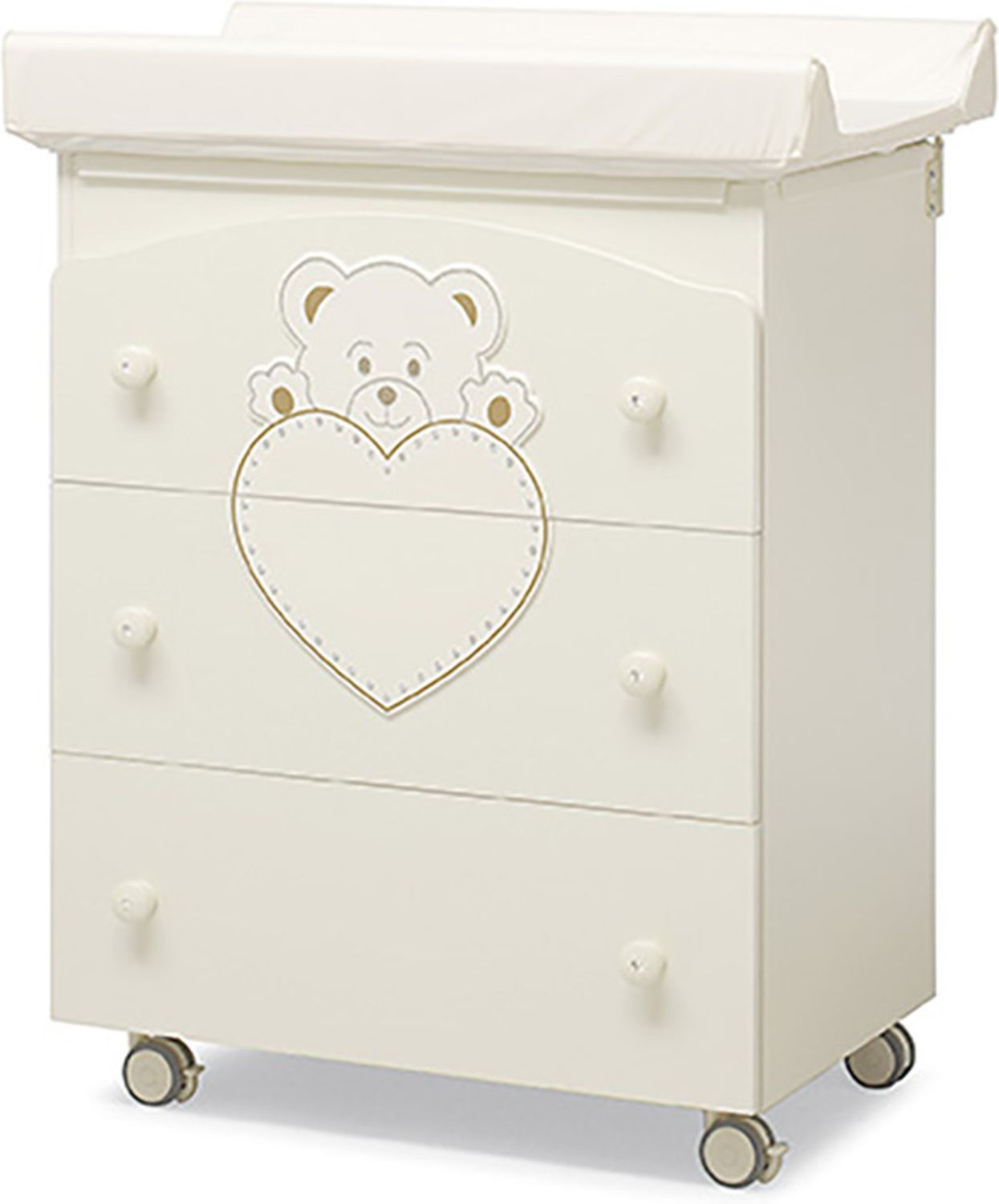 Приятные особенности :Комод пеленальный Erbesi Cucciolo выполнен из качественных безопасных материалов, обработан нетоксичными красками на водяной основе. Конструкция дополнена колёсами со стопором. Три вместительных ящика легко и бесшумно выдвигаются и задвигаются обратно. Пеленальную поверхность можно убрать, превратив детский комод в обычную мебель.